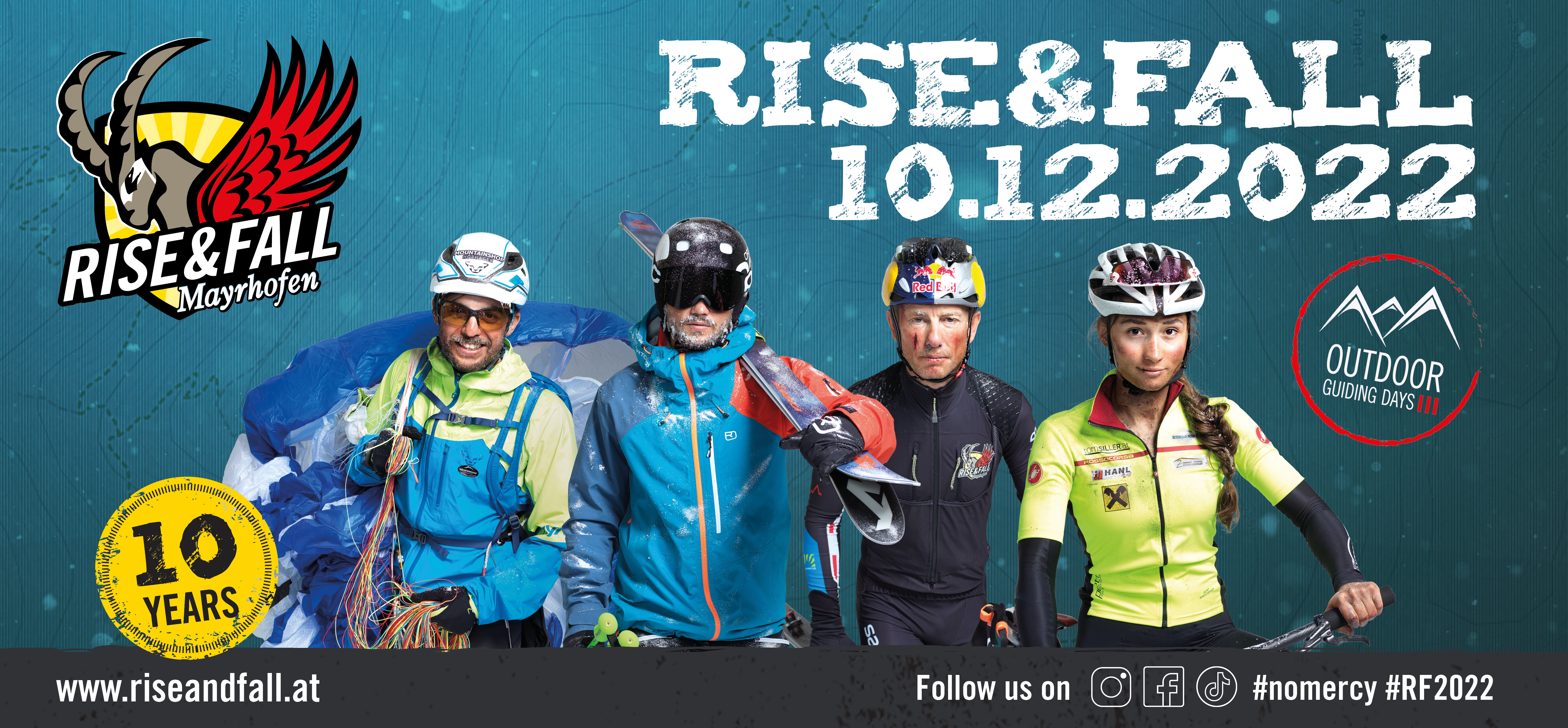 Auch im Jubiläumsjahr gilt wieder das Motto „Vier Leute, ein Team, kein Erbarmen“. Viererteams aus der ganzen Welt treten in den Disziplinen Skibergsteigen, Paragleiten, Mountainbiken und Skifahren gegeneinander an. Erstmalig gibt es auch eine SINGLE RACE Wertung: Ein Einzelbewerb, bei den fünf exklusive Startplätze für Einzel-Athletinnen und Athleten vergeben werden, die alle vier RISE&FALL Disziplinen alleine meistern.
