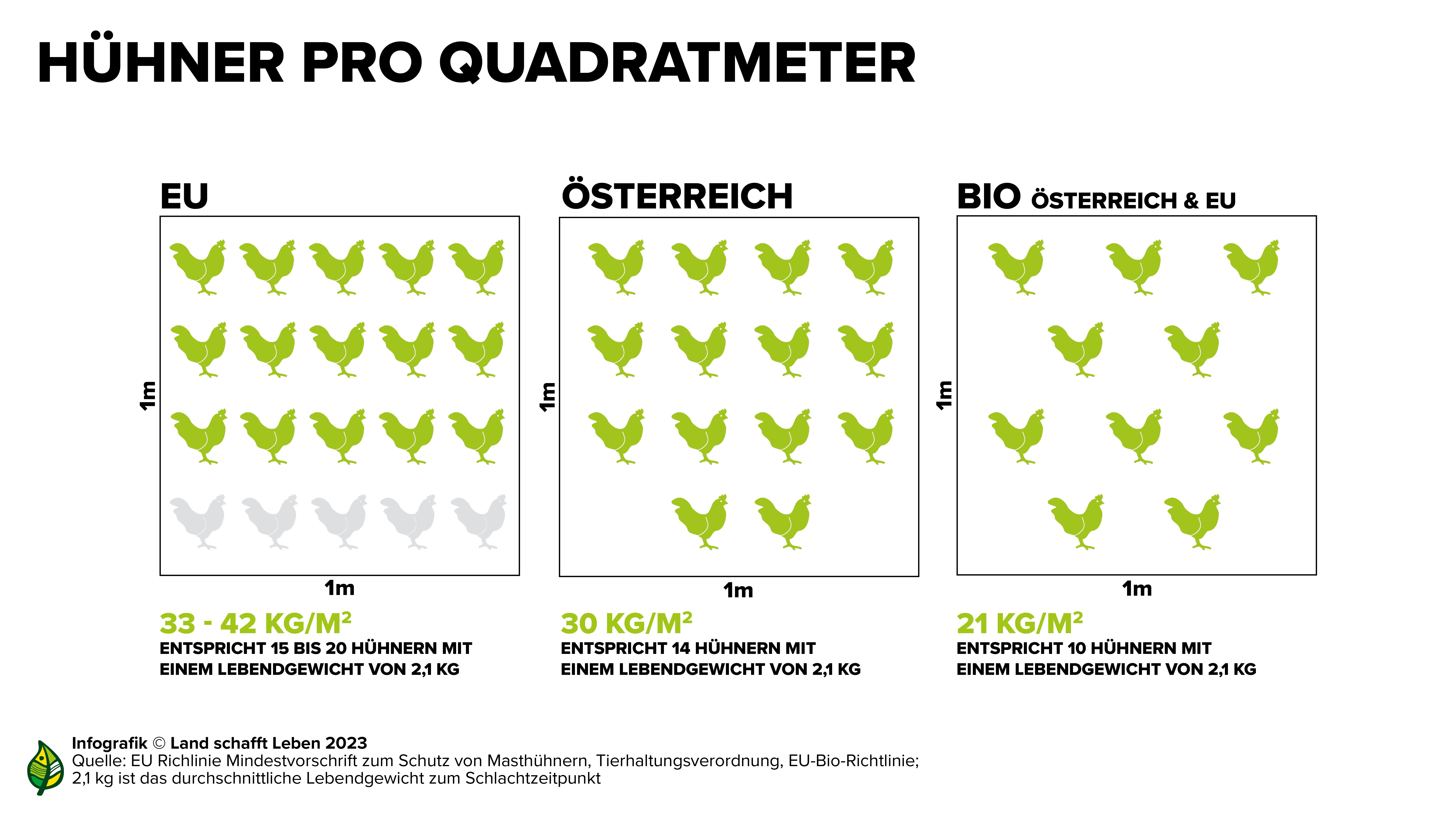 In Österreich haben Masthühner so viel Platz im Stall wie in keinem anderen EU-Land. Das erlaubte Gewicht an Hühnern pro Quadratmeter ist hierzulande mit 30 Kilogramm limitiert. EU-Vorschriften hingegen erlauben 33 Kilogramm, in Ausnahmefällen sogar bis zu 42. Das bedeutet: Das österreichische Tierschutzgesetz sieht durchschnittlich zwischen ein und sechs Hühner pro Quadratmeter weniger vor, als es die EU-Regelung erlauben würde.
