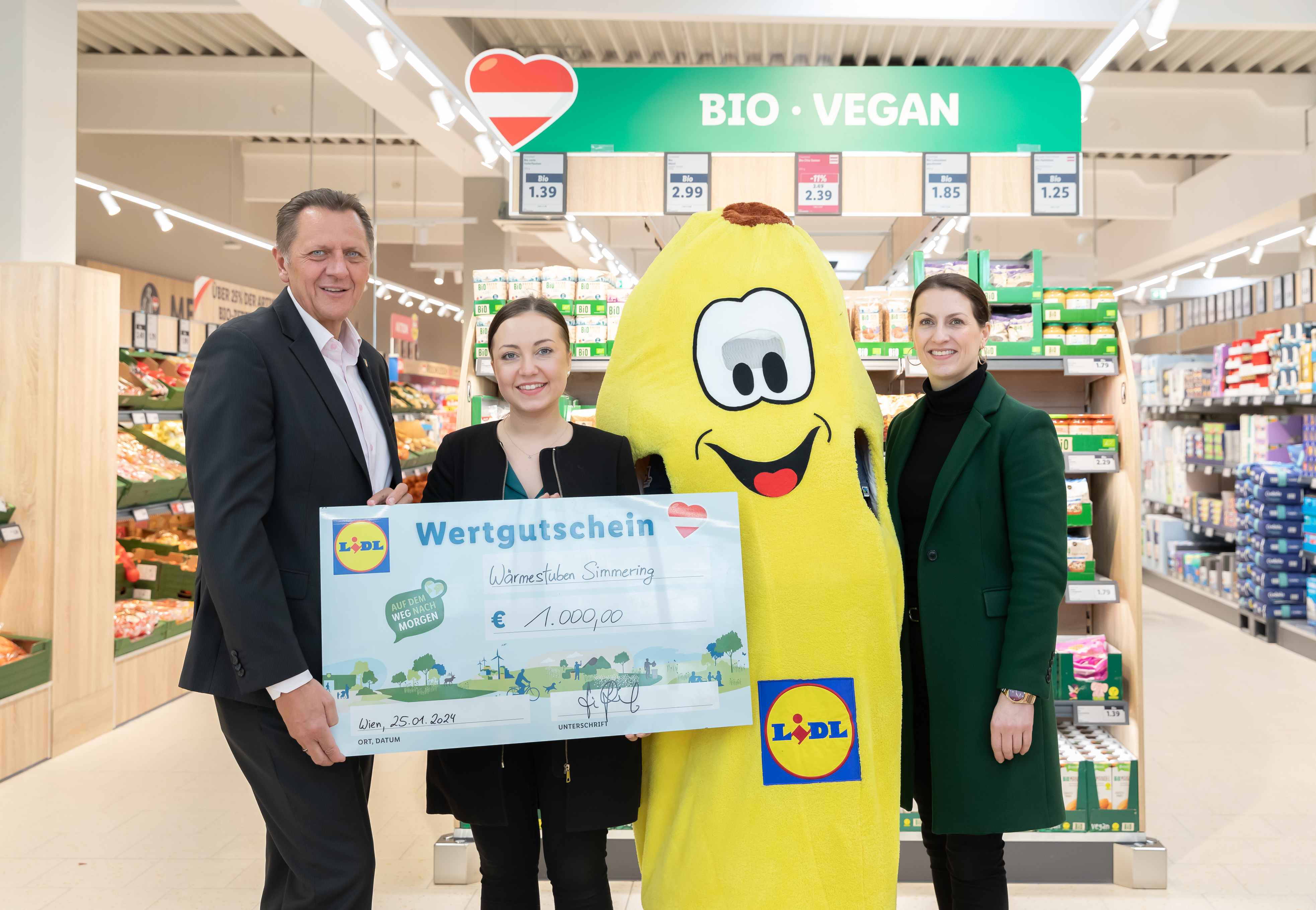 Bei der Eröffnungsfeier am Donnerstag kam auch der soziale Aspekt nicht zu kurz: Lidl Österreich arbeitet bereits seit mehreren Jahren intensiv mit sozialen Einrichtungen wie beispielsweise der Caritas oder Soma- und Vinzimärkten zusammen. Im Rahmen der Neueröffnung wurde auch ein Gutschein im Wert von 1.000 Euro an die Wärmestuben Simmering übergeben.