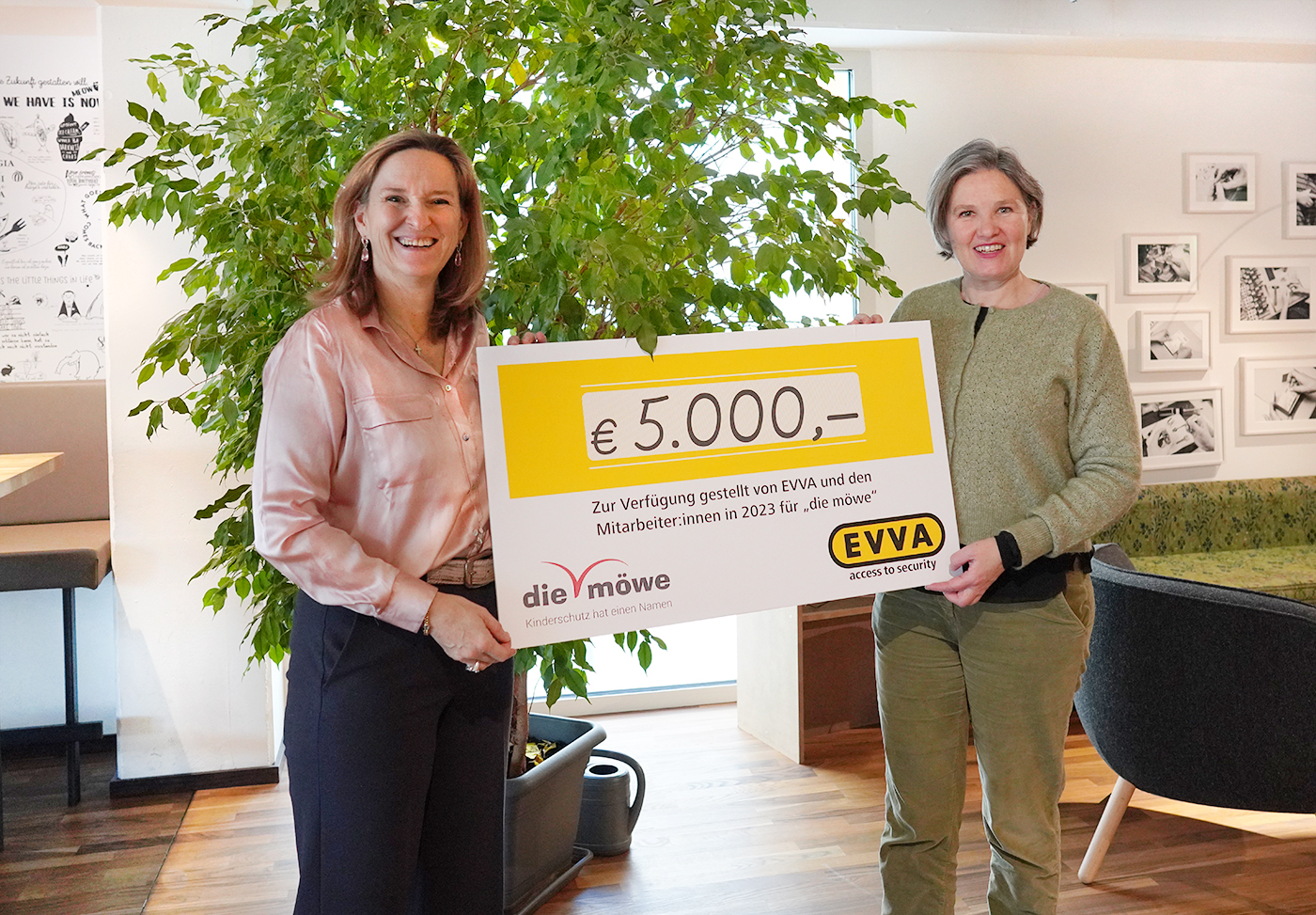 EVVAs Beitrag aus 2023 für den Kinderschutz: Die Spenden von EVVA- Mitarbeiter:innen und der Geschäftsleitung, sowie der Erlös der beliebten Charity-Bar der letzten Weihnachtsfeier in Wien ergaben im Jahr 2023 erneut die stolze Summe von 5.000 Euro für die österreichische Kinderschutzorganisation „die möwe“.