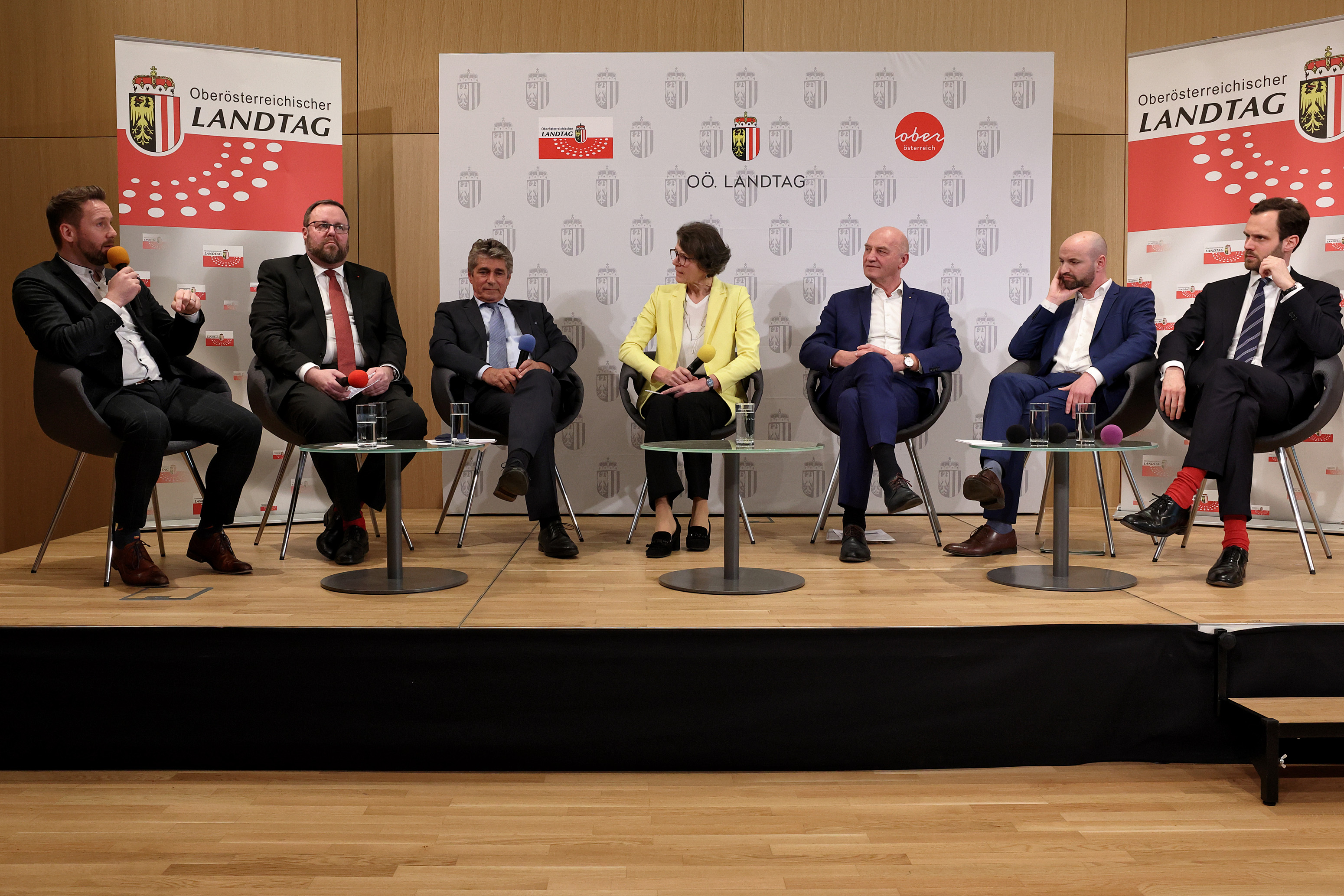 Den zweiten Teil des Symposiums bildete die Diskussion der Klubobleute, konsequent und in den Fragen beharrlich geführt von Dr.in Christine Haiden. Das einstündige Gespräch umfasste die Grundlagen der Demokratie, das Verhältnis zwischen den politischen Vertreterinnen und Vertreter und den wählenden Menschen ebenso wie Anpassungen der Landtagsgeschäftsordnung. Die aufgrund der Vertretung von Sabine Engleitner-Neu, Klubobfrau der SPÖ, durch ihren Stellvertreter Tobias Höglinger rein männliche Runde lieferte sich eine intensive Diskussion. Im Folgenden eine Zusammenfassung in Form von Zitaten der sechs Diskutanten: