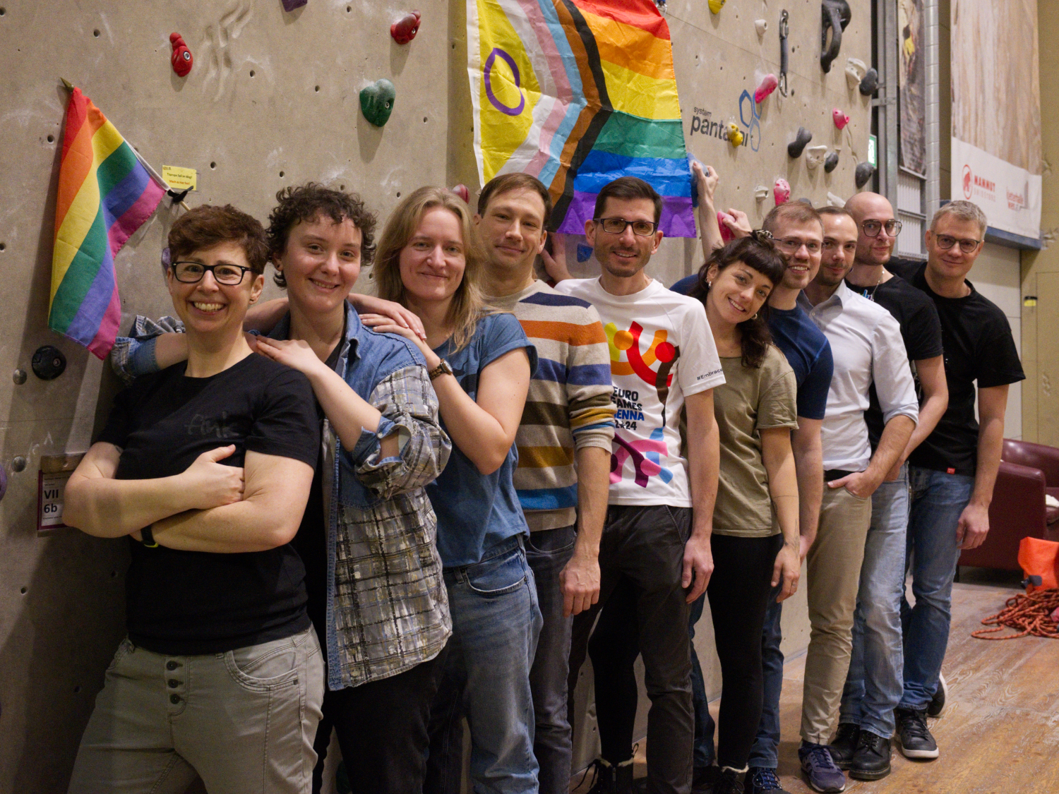 Bild 1: Das Team der EuroGames Vienna 2024 (v.l.n.r. Bianca Gebhart, Larissa Huber, Maria Schinko, Christopher Rössler, Gerhard Marchl, Ines Mayrhofer, Razvan Ghinia, Benno Larch, Candy Licious und Rene Gabner) © Isabelle Reihofer