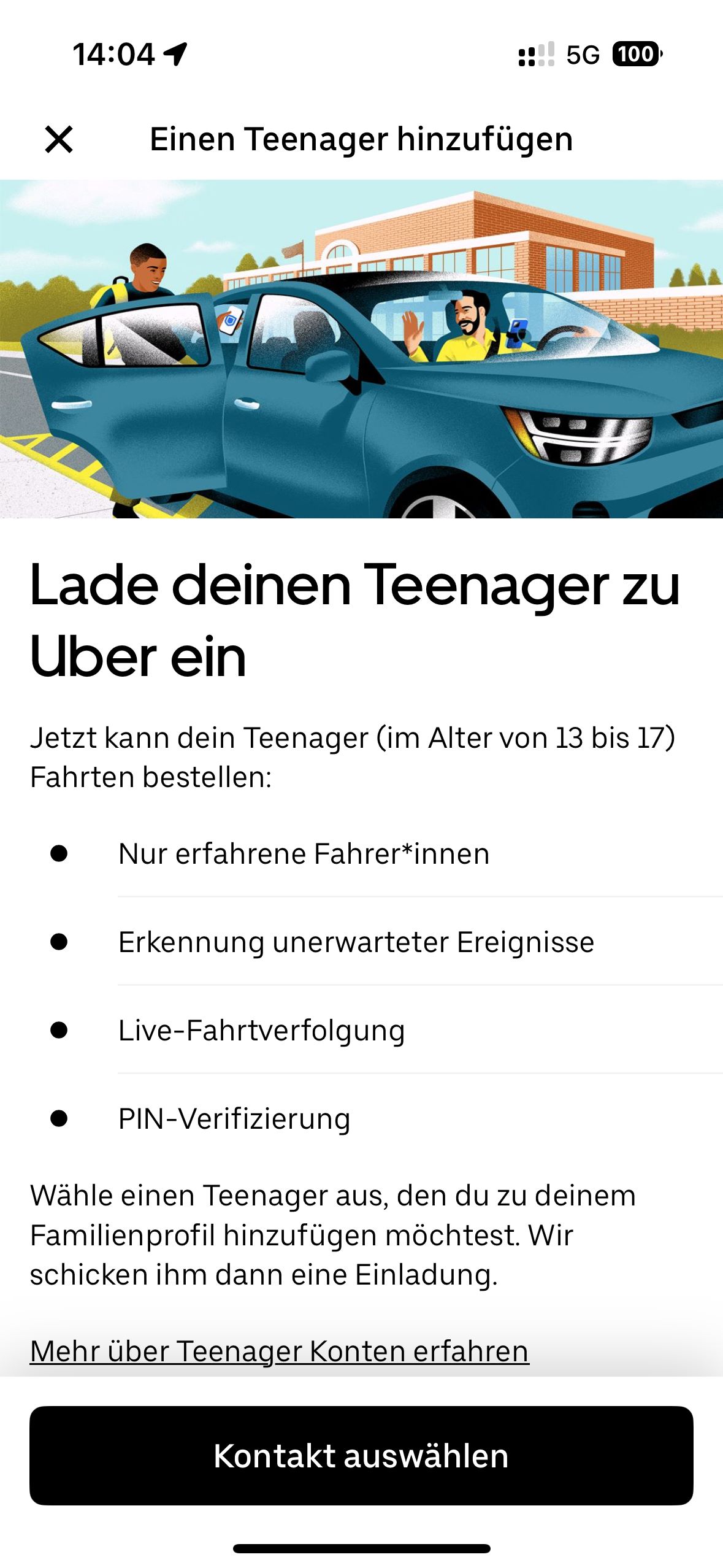 Bei allen Fahrten von Teenagern sind automatisch zahlreiche Sicherheitsfunktionen aktiviert, darunter PIN-Verifizierung, Live-Fahrtenverfolgung, Benachrichtigungen bei unerwarteten Ereignissen und Zugriff auf den Notfallknopf von Uber. Diese Funktionen können weder vom Teenager noch von Fahrer*innen oder den Eltern deaktiviert werden. Für die Entwicklung dieser Teenager-Konten hat Uber zudem mit Sicherheitsexperten und Elternorganisationen wie Safe Kids Worldwide und ParentZone zusammengearbeitet, die sich dafür einsetzen, die Online-Welt zu einem sicheren und positiveren Ort für Familien und Kinder zu machen.