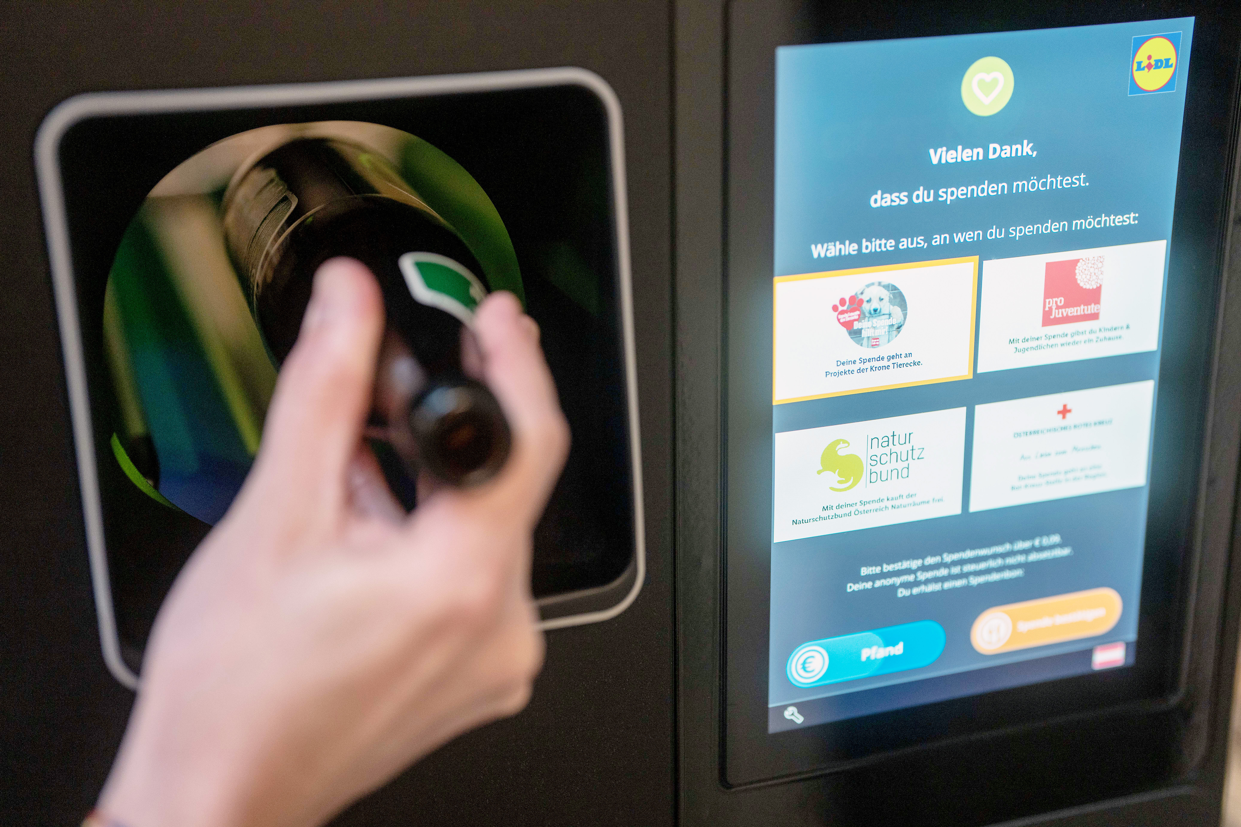 Auf eine Besonderheit ist man besonders stolz: Lidl Kund:innen können nicht nur ihr Leergut zurückgeben, sondern per Knopfdruck die Pfandbonsumme einfach und unbürokratisch an mittlerweile vier verschiedene Organisationen in Österreich spenden. Die Erlöse kommen je nach Auswahl dem Österreichischen Roten Kreuz, Pro Juventute, dem Naturschutzbund oder dem Verein „Freunde der Tierecke“ zugute.