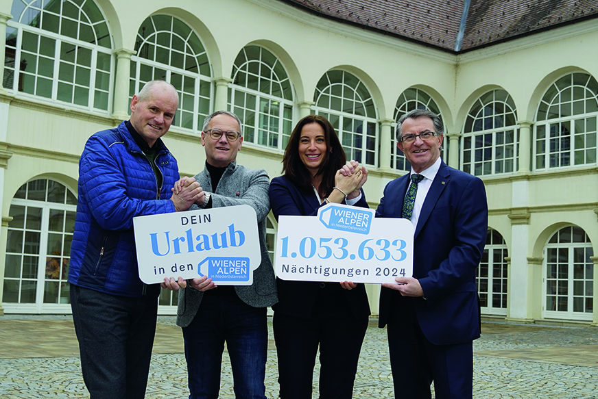 Über das Tourismusjahr 2024 ziehen die Wiener Alpen eine erfreuliche Bilanz. Gegenüber dem Jahr 2023 sind die Nächtigungen um 2,46 Prozent auf 1.053.633 gestiegen. Während sich der Inlandsmarkt relativ stabil entwickelte (plus 3.759 Nächtigungen), gab es bei Gästen aus dem Ausland einen Zuwachs von 21.546 Nächtigungen. Gemeinsam mit der Niederösterreich Werbung bearbeiten die Wiener Alpen die Auslandsmärkte Ungarn, Slowakei, Tschechien und Deutschland. Im Sommerhalbjahr verzeichnen die Wiener Alpen mehr Nächtigungen als im Winterhalbjahr. Der nächtigungsstärkste Monat war im Jahr 2024 der August mit 117.974 Nächtigungen (+ 3,2 %).