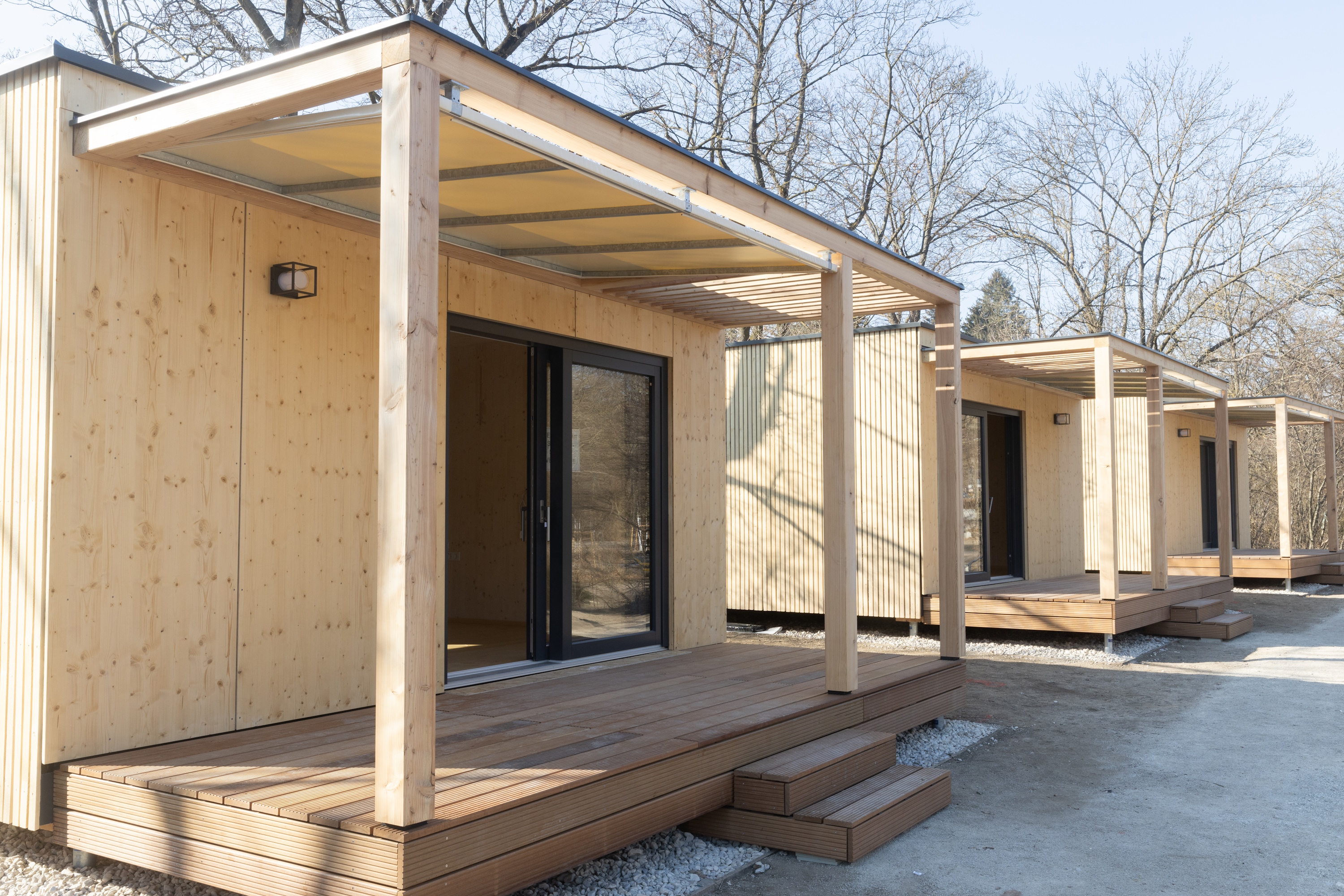 - 5 Tiny Houses mit 24 Quadratmeter (Wohn- und Schlafraum, Sanitär, begrünte Holzterrasse, Klimaanlage)