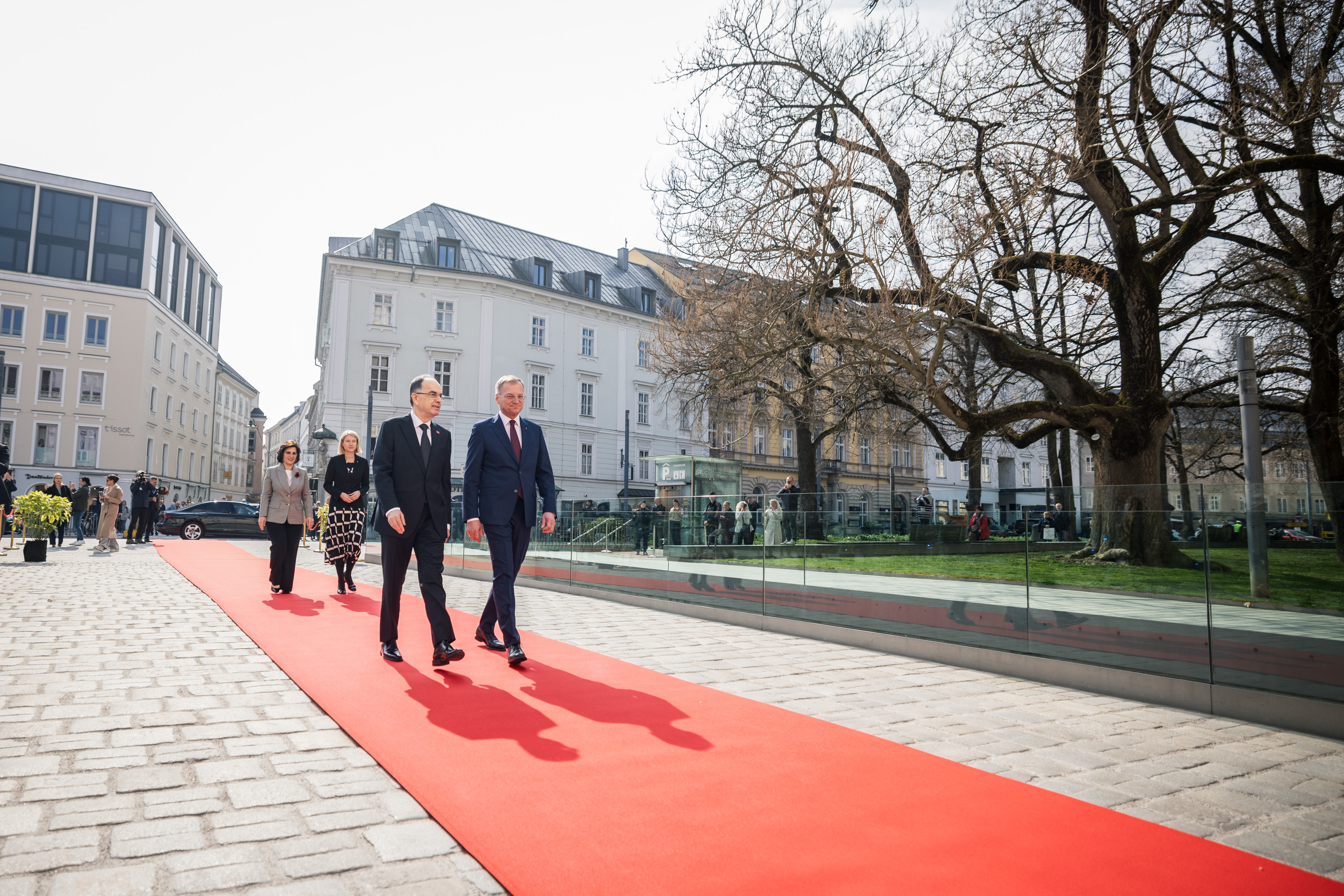 Während Präsident Begaj und LH Stelzer die aktuelle politische und wirtschaftliche Lage sowie Zusammenarbeitsmöglichkeiten diskutierten, erkundete Albaniens First Lady, Armanda Begaj, gemeinsam mit LH-Stv.in Christine Haberlander und Kulturdirektorin Margot Nazzal das Landhaus – sie erhielten eine Führung auf Englisch.