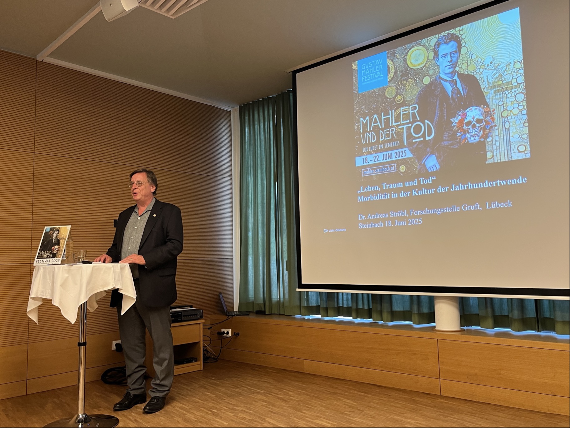Am Abend wurde zu einer Präsentation zum Thema „Leben, Traum und Tod: Morbidität in der Kultur der Jahrhundertwende“ in den Christian-Ludwig-Attersee-Saal in Steinbach am Attersee geladen. Kulturwissenschaftler Dr. Andreas Ströbl gab allen Teilnehmer:innen Einblick in die Werke aus Mahlers Zeit, deren Denker sich mit einem nüchternen Bild von Verfall, Dekadenz und Morbidität konfrontiert sahen. Inwiefern sich diese Komplexe geäußert haben und welche Rolle Gustav Mahler in dieser Zeit spielte, stellte Dr. Ströbl dem Publikum vor.