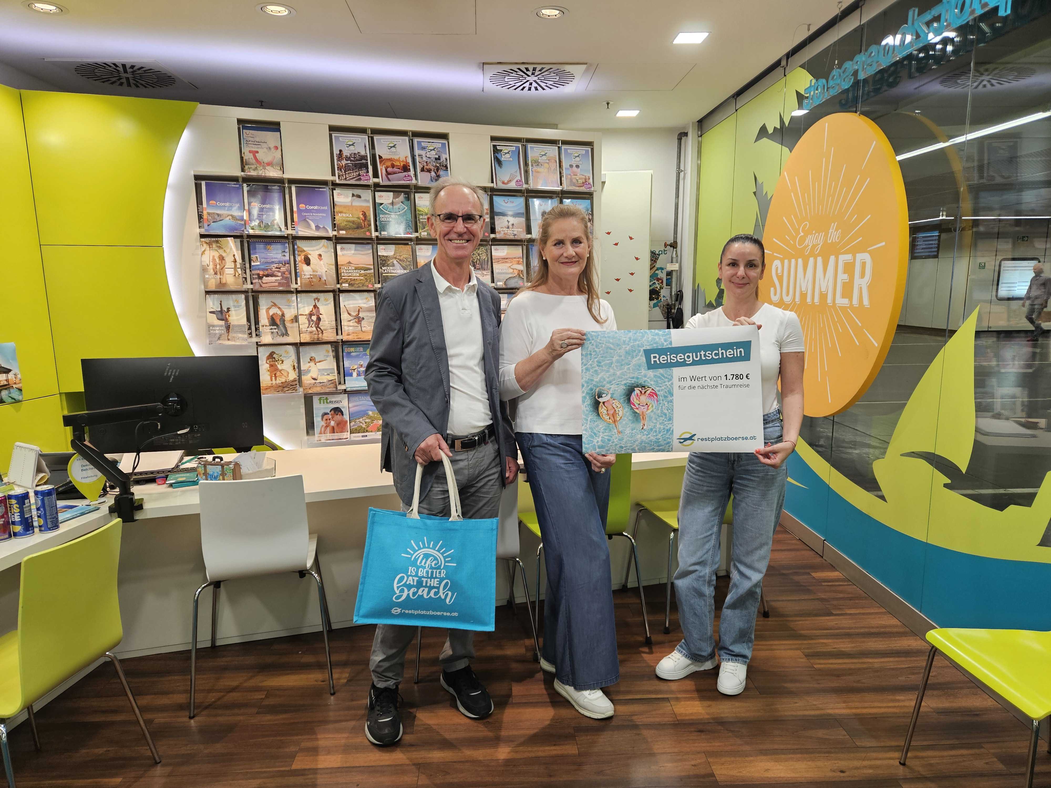 Ilse und Peter S. aus Wien hatten sich in der Filiale am Schwedenplatz für einen spontanen Last Minute Urlaub nach La Gomera entschieden. Das Paar freut sich: „Wir buchen gerne spontan und werden bei der Restplatzbörse immer bestens beraten. Dass wir jetzt auch noch gewonnen haben, ist das i-Tüpfelchen!“ Den Reisegutschein im Wert von 1.780 € überreichte Filialleiterin Denitsa Belchev am 29. Juli 2025.