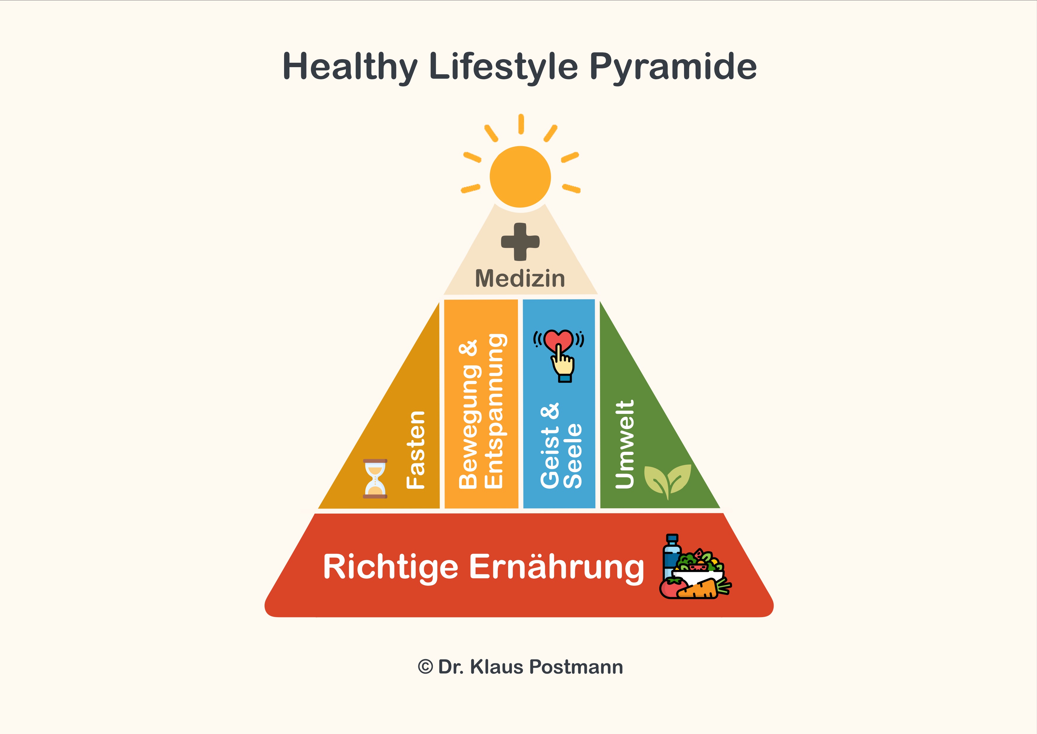 Ein zentrales Konzept des Buches ist die Healthy-Lifestyle-Pyramide, die von Dr. Postmann entwickelt wurde, und die sechs wesentlichen Faktoren für gesundes Altern und die Prävention stiller Entzündungen beschreibt. Sie dient als ganzheitliches Modell, das präventive und therapeutische Maßnahmen miteinander verbindet – immer in Ergänzung zur Schulmedizin.