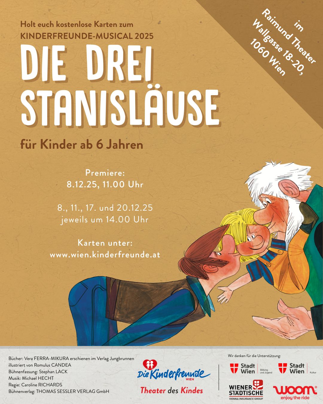 Kinderfreundemusical "Die drei Stanisläuse" feiert am 8. Dezember Premiere Caroline Richards (Regie), Michael Hecht (Musik), Stephan Lack (Bühnenfassung) 6.000 Kinder werden von den Kinderfreunden ins Raimund Theater eingeladen