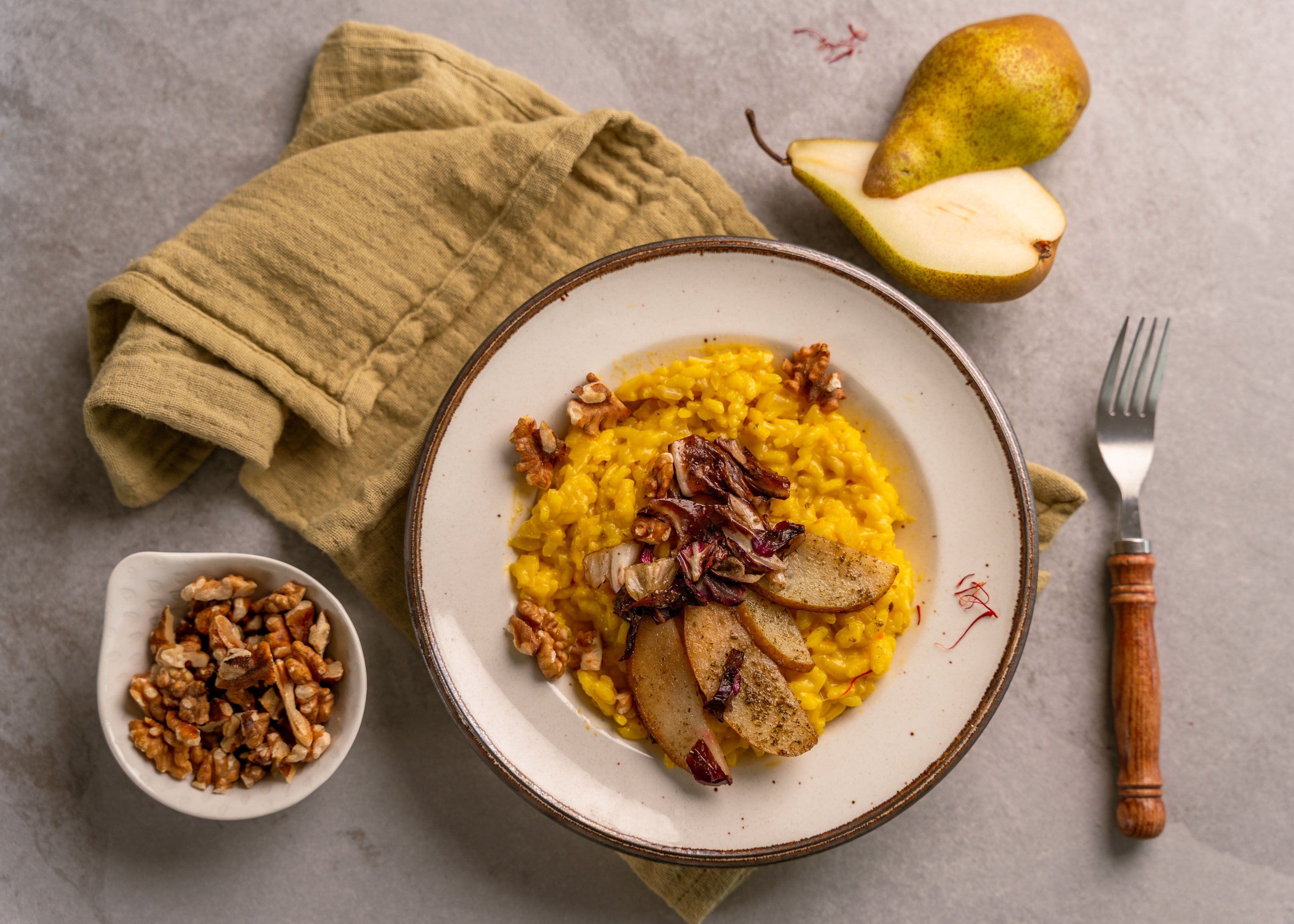 Dieses aromatische Safran-Risotto zeigt, dass es auch ganz ohne Alkohol rund schmeckt – und das dank einer besonderen Zutat: Der Grüntee Die frische Lady Green verfeinert das cremige Reisgericht mit seiner zitronig-herben Note. Das Topping aus gebratenem Radicchio, süßen Birnenscheiben, Wintergemüse-Gewürz und gerösteten Walnüssen macht das Gericht zum farbenfrohen Highlight für die alkoholfreie Genießer:innenküche.