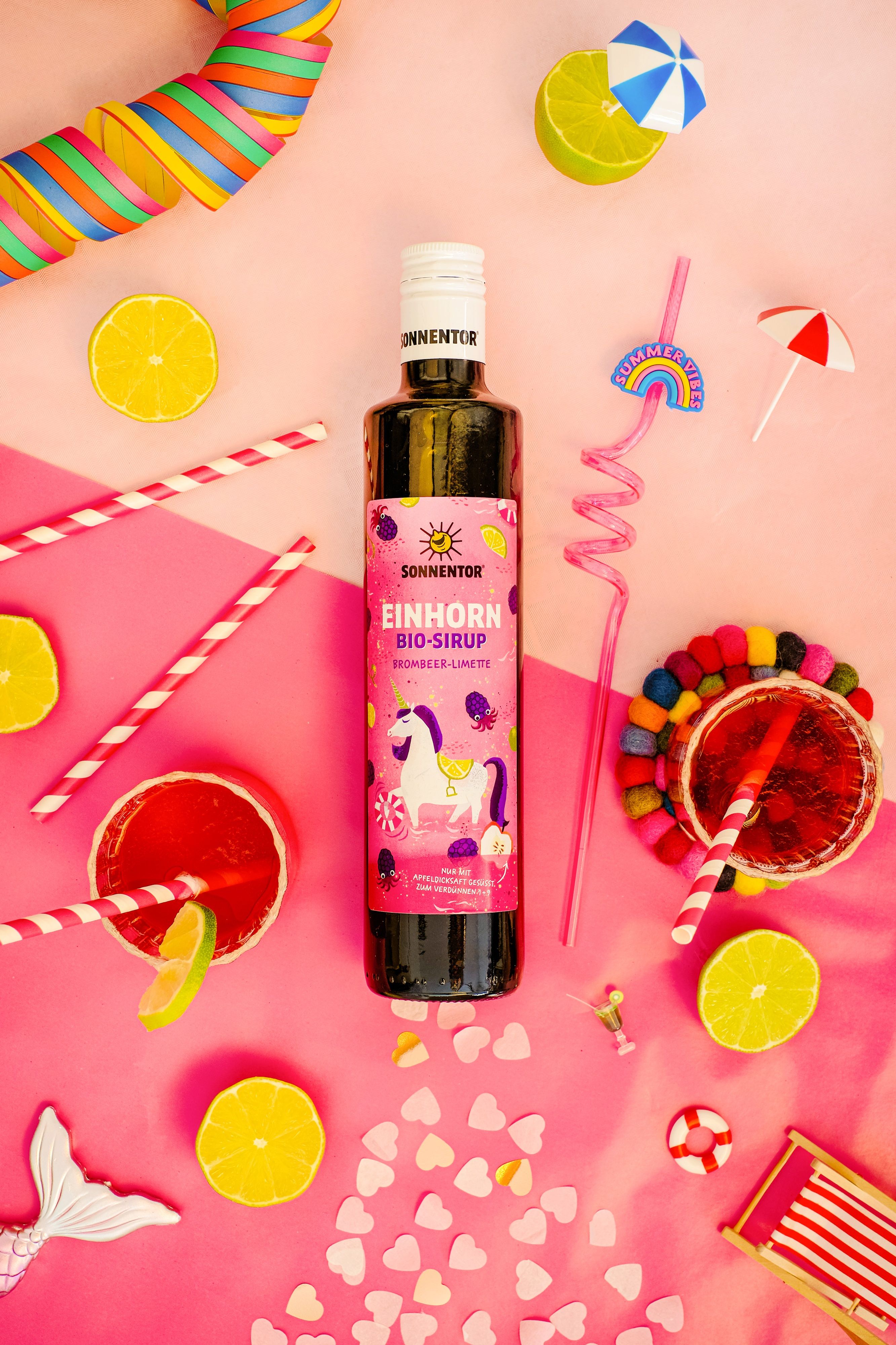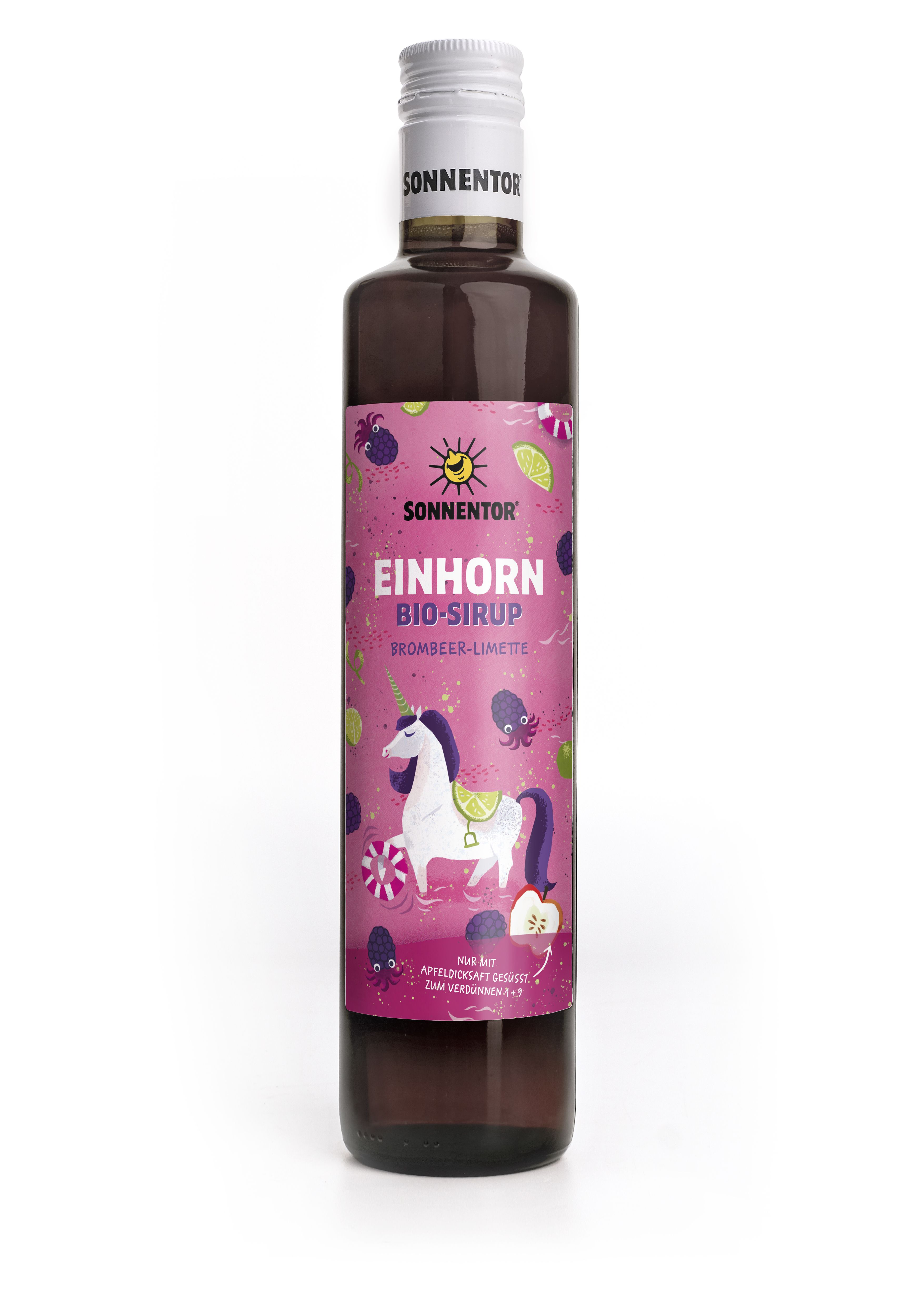 Diese Sonder-Edition gibt es ab 1. Mai 2026 exklusiv im SONNENTOR Eigenvertrieb. Der Sirup überzeugt mit seiner beerigen Frische, sowie einem zauberhaften Einhorn-Design. Schmeckt süßlich-säuerlich nach Brombeeren und Limette. Ganz einfach 1 Teil Sirup mit 9 Teilen Wasser mischen und fertig ist das ideale Erfrischungsgetränk. Dieser Sirup ist mit Apfeldicksaft gesüßt!