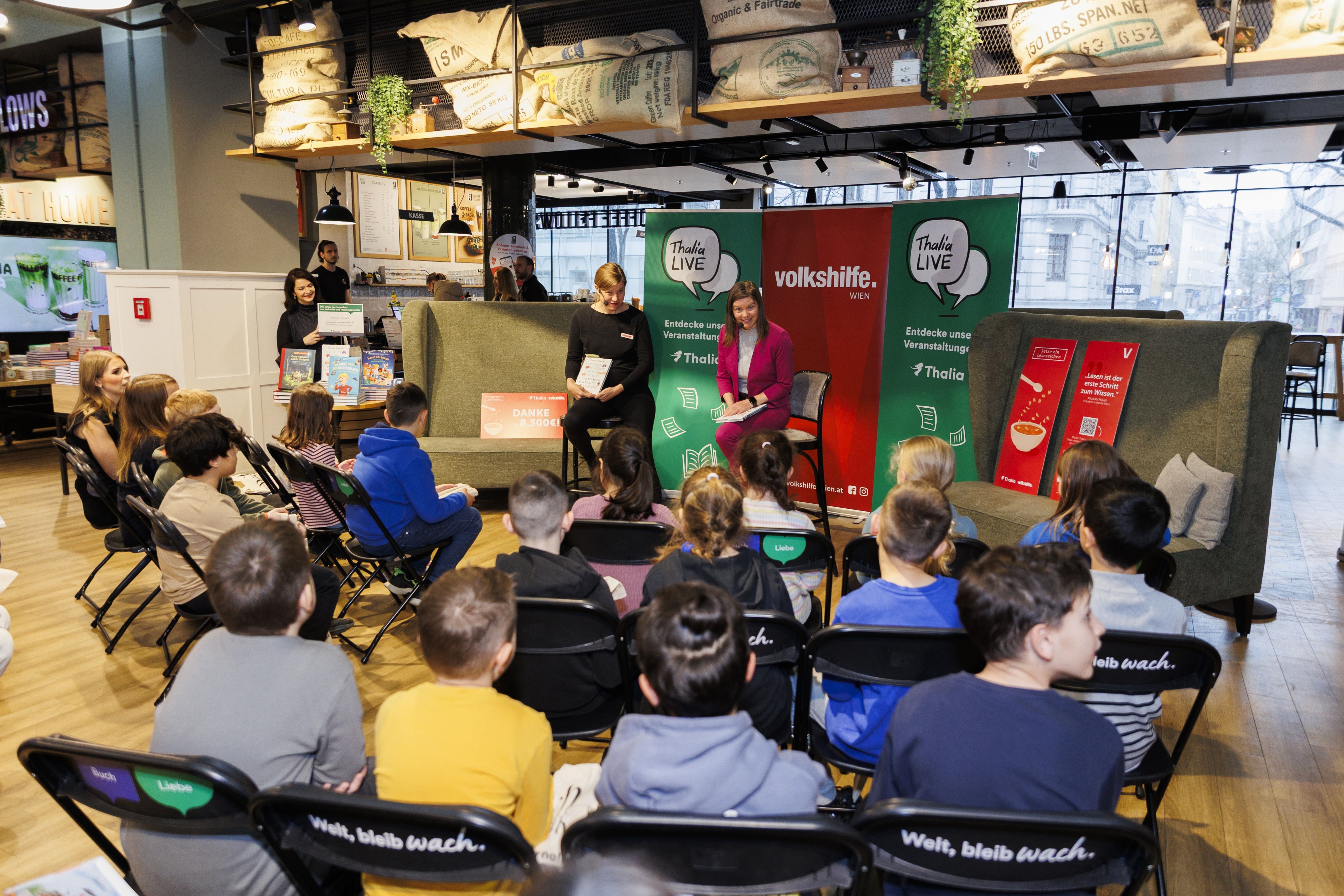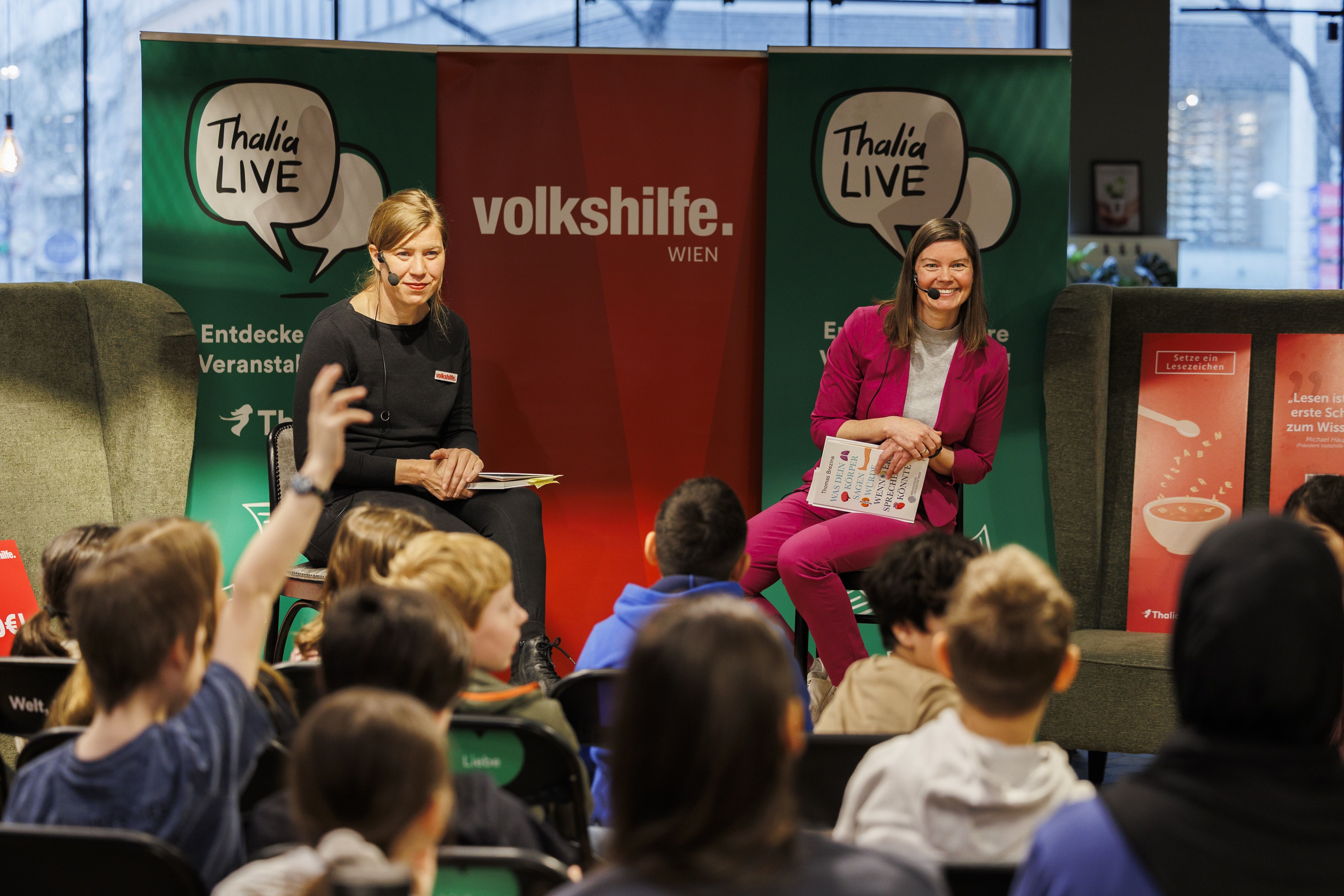 Im Anschluss lasen Andrea Heumann und Judith Ranftler gemeinsam einer 3. Klasse der Volksschule Bildungscampus Sonnwendviertel aus dem Buch „Was dein Körper sagen würde, wenn er sprechen könnte“ von Thomas Brezina vor. Die Aktion zeigt: Bildungsgerechtigkeit beginnt mit dem Zugang zu Büchern. Thalia und Volkshilfe Wien setzen die Partnerschaft 2026 fort.