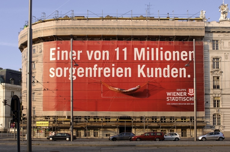 "Sorgenfreier Kunde" macht es sich auf Hängematte am Schwarzenbergplatz Nr.13 gemütlich Wien (OTS) - Was in Berlin, London und New York schon zum Stadtbild gehört, nimmt nun auch in Wien Gestalt an: Dreidimensionale Werbesujets, bei denen die Werbefläche mit einem Objekt erweitert wird. Ein spektakuläres Beispiel dafür ist derzeit am Schwarzenbergplatz zu bestaunen. Dort hat Megaboard Werbeplakat Soravia am Haus Nr. 13 für die Wiener Städtische Versicherung ein Werbenetz platziert, vor dem eine riesige Puppe in einer Hängematte baumelt. Damit wird der Slogan "Einer von 11 Millionen sorgenfreien Kunden" plastisch in Szene gesetzt. Die insgesamt 7,5 m lange und 150 kg schwere Puppe wurde von den Firmen Plakativ und Balloonart aus Rohrskelett gefertigt und mit Styroporflocken und Luftpolsterfolie ausgekleidet. Sowohl der "Sorgenfreie Kunde" als auch die Hängematte im Format 10 x 3 Meter wurden mittels hydraulischer Hebebühne von der Firma Werbemontagen sachgerecht in einer Höhe von ca.15 m über dem Boden angebracht. Das Megaboard Netz wird gemäß der Verordnung für Standorte in der Inneren Stadt von einer Fassadenspiegelung umrahmt, die die Optik des dahinterliegenden Gebäudes wiedergibt. Zwölf Hochfrequenz Halogenscheinwerfer sorgen dafür, dass der "Sorgenfreie Kunde" und die Werbefläche auch bei Dunkelheit gut sichtbar sind. Megaboard Werbeplakat Soravia vermarktet insgesamt rund 300 Großwerbeflächen in Wien und in den Bundesländern. Die Bandbreite reicht vom Megaboard Classic im Format 8 x 5 m über Megaboard Prisma, das bei gleichem Format einen sekundenschnellen Sujetwechsel ermöglicht, bis hin zu den ab 100 m2 grossen Megaboard Netzen an Baugerüsten. Die besonders leuchtintensiven Megaboard Backlights und Sonderformate für den individuellen Bedarf runden das Angebot ab. Bild(er) zu dieser Meldung finden Sie im AOM/Original Bild Service, sowie im OTS Bildarchiv unter http://bild.ots.at Rückfragehinweis: Megaboard Presse Agentur Dr. Neureiter Tel: +43 1 924 60 87 e-mail: [email protected] *** OTS-ORIGINALTEXT UNTER AUSSCHLIESSLICHER INHALTLICHER VERANTWORTUNG DES AUSSENDERS *** OTS0150 2005-10-17/12:56 171256 Okt 05