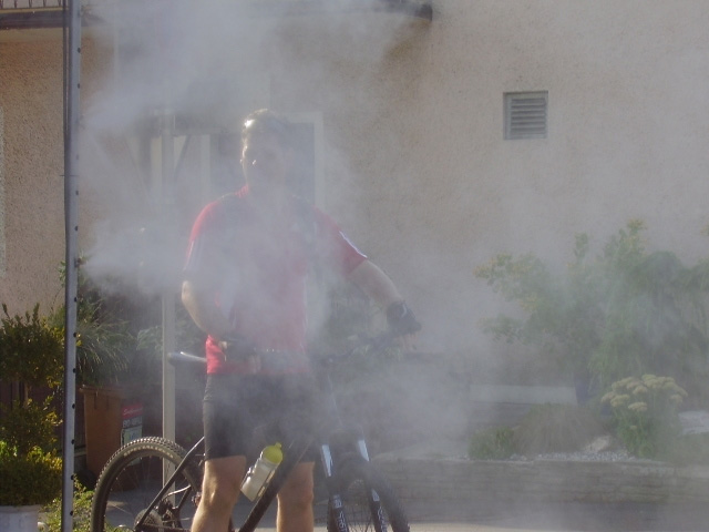 Im Bild: Radfahrer kühlt sich an einem Wasserrauchsystem
