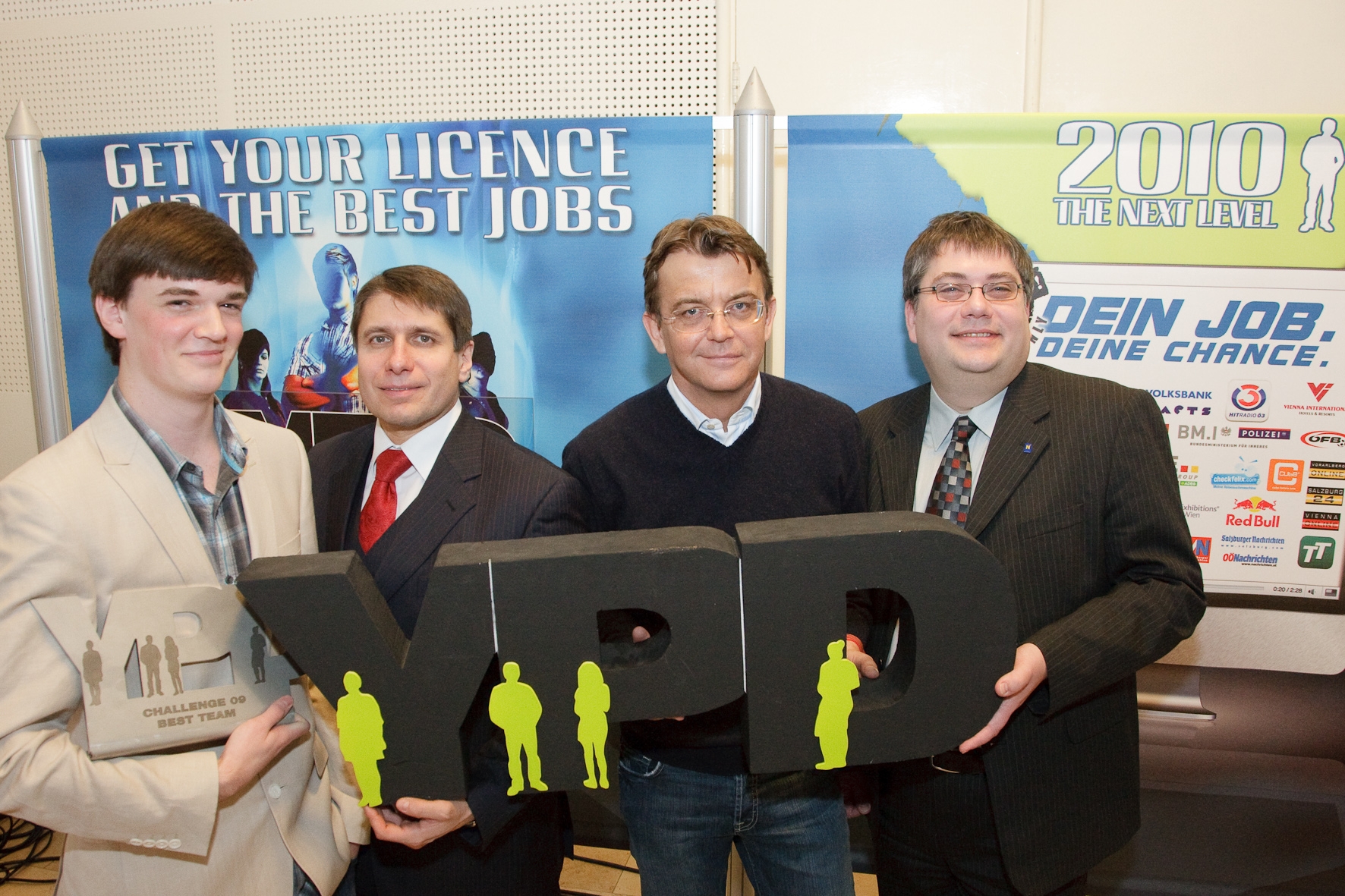 v.l.n.r.: Laurin Schneider - Sieger YPD-Challenge 09, Mag. Markus Beyrer - Generalsekretär der Industriellenvereinigung, Hannes Jagerhofer - Initiator der YPD-Challenge, Univ. Prof. Mag. Dr. Michael Wagner, MBA - Donau-Universität Krems