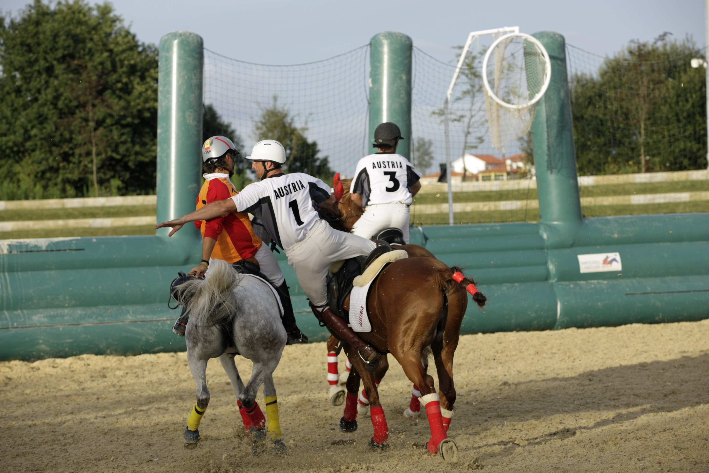 sich die Spieler mit den Pferden berühren. Ein Schiedsrichter zu