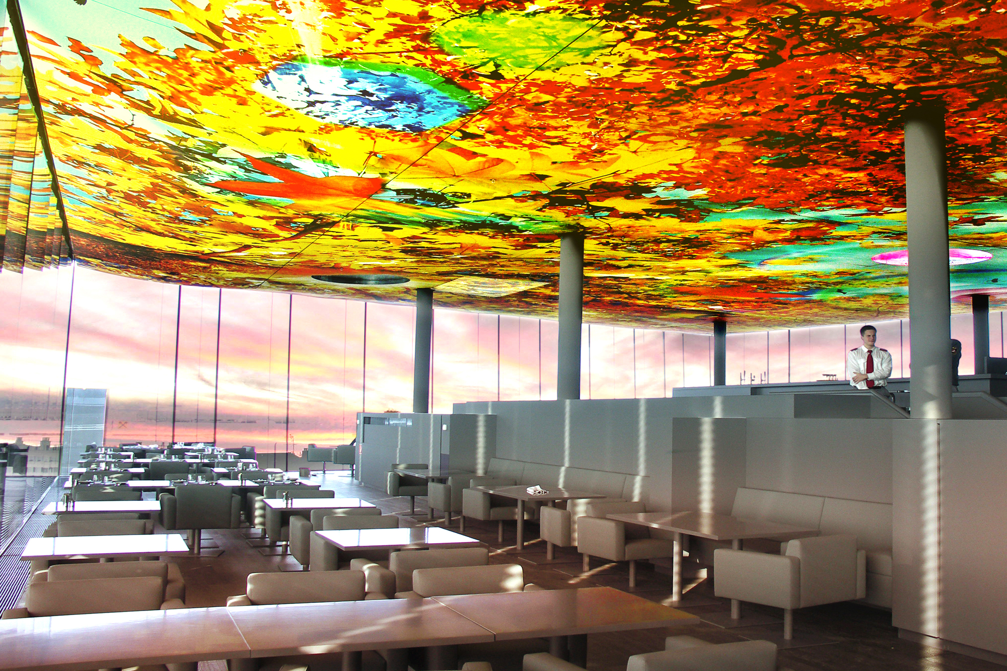 - Lichtdecke 2000qm, bedruckt und beleuchtet - 300qm Decke, bedruckt und unbeleuchtet - Ausleuchtung mit 4500 Leuchtstofflampen, dimmbar - Rahmenkonstruktion: Aluminium-Profil-Leichtbauweise - Bespannung / Material: Textilgewebe B-s1,d0 - Bespannung / Technik: Textilgewebe mit Keder und Spiralfedern - Bespannung / Druck: Digital-Doppeldruck mit UV-härtender, lösemittelfreier Tinte