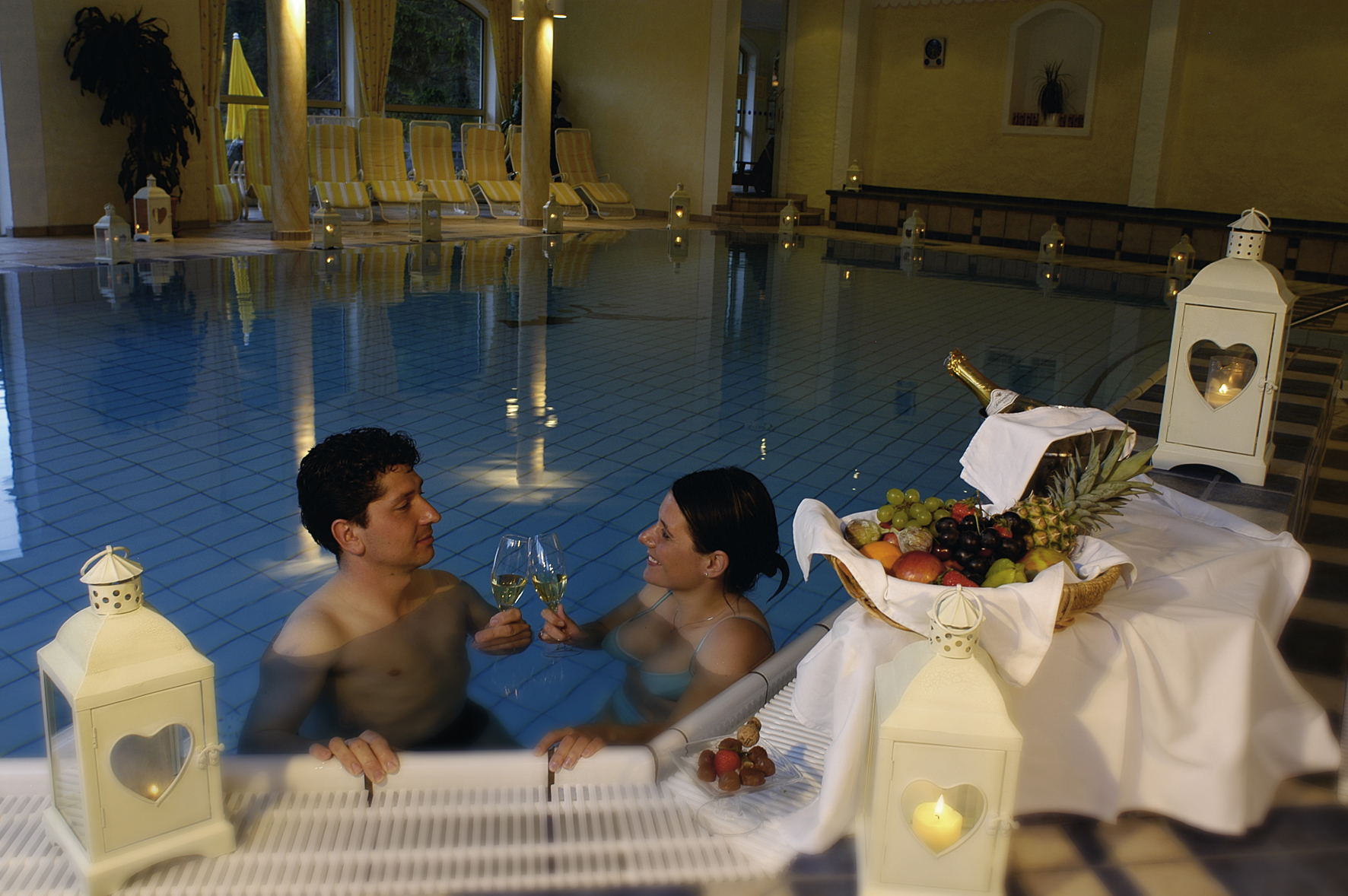 im Indoor-Pool mit einer Flasche prickelndem Schlumberger Sekt und