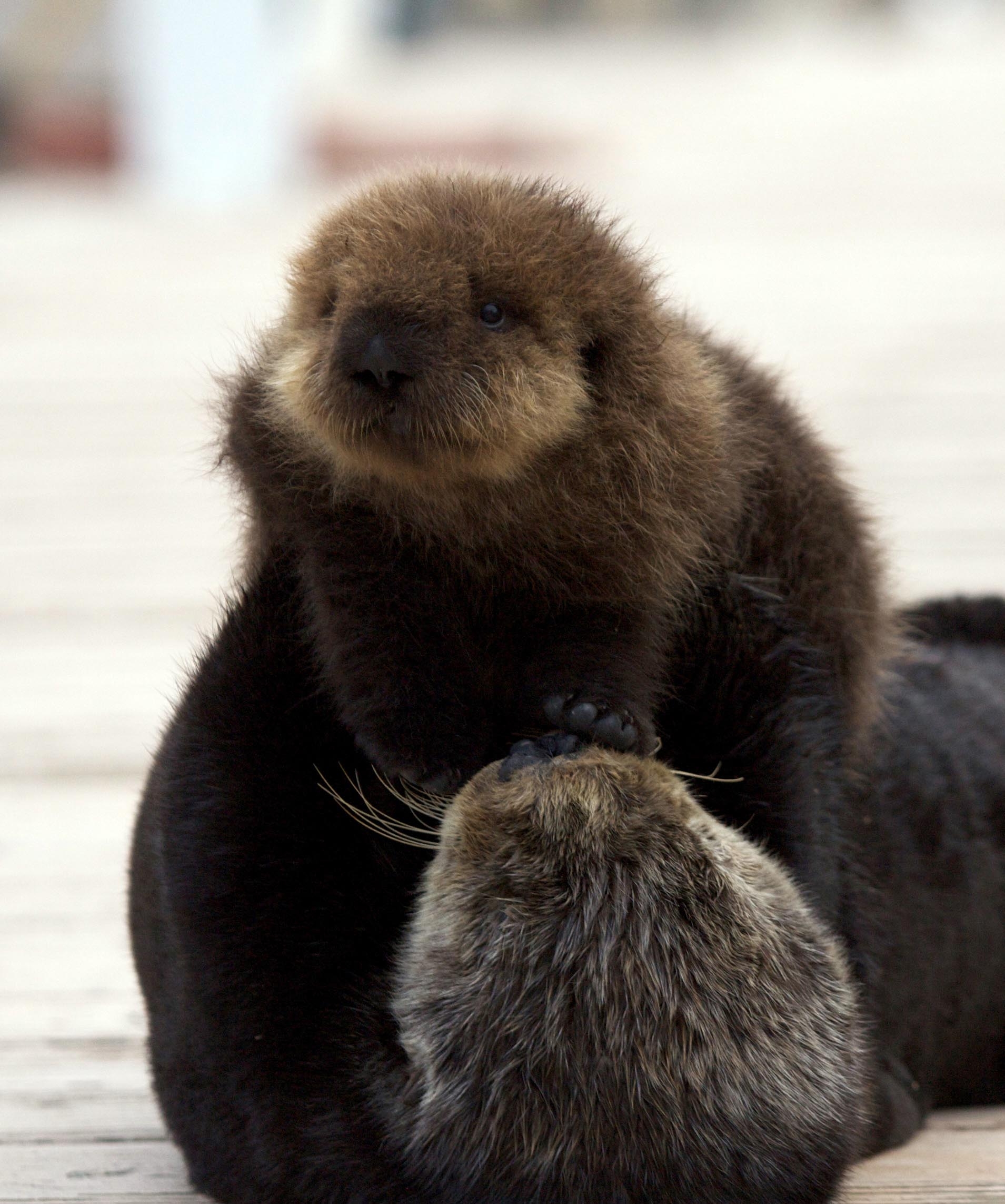 Seeotterbaby, das erste Erfahrungen sammelt: auf Mutters Bauch in der