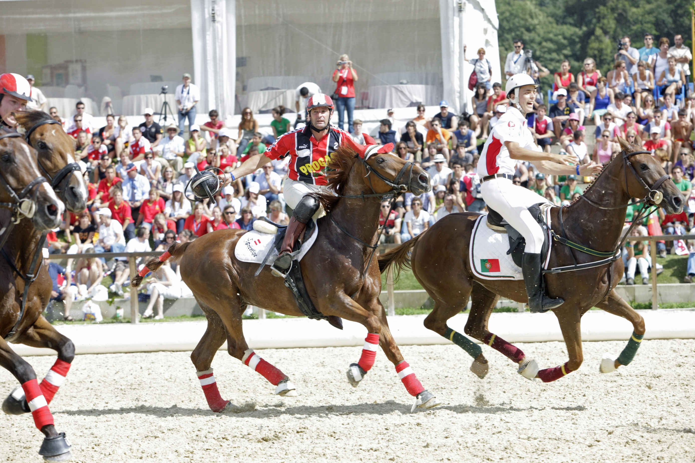 gespielt. Ohne den Fuß auf den Boden zu setzen heben die ReiterInnen