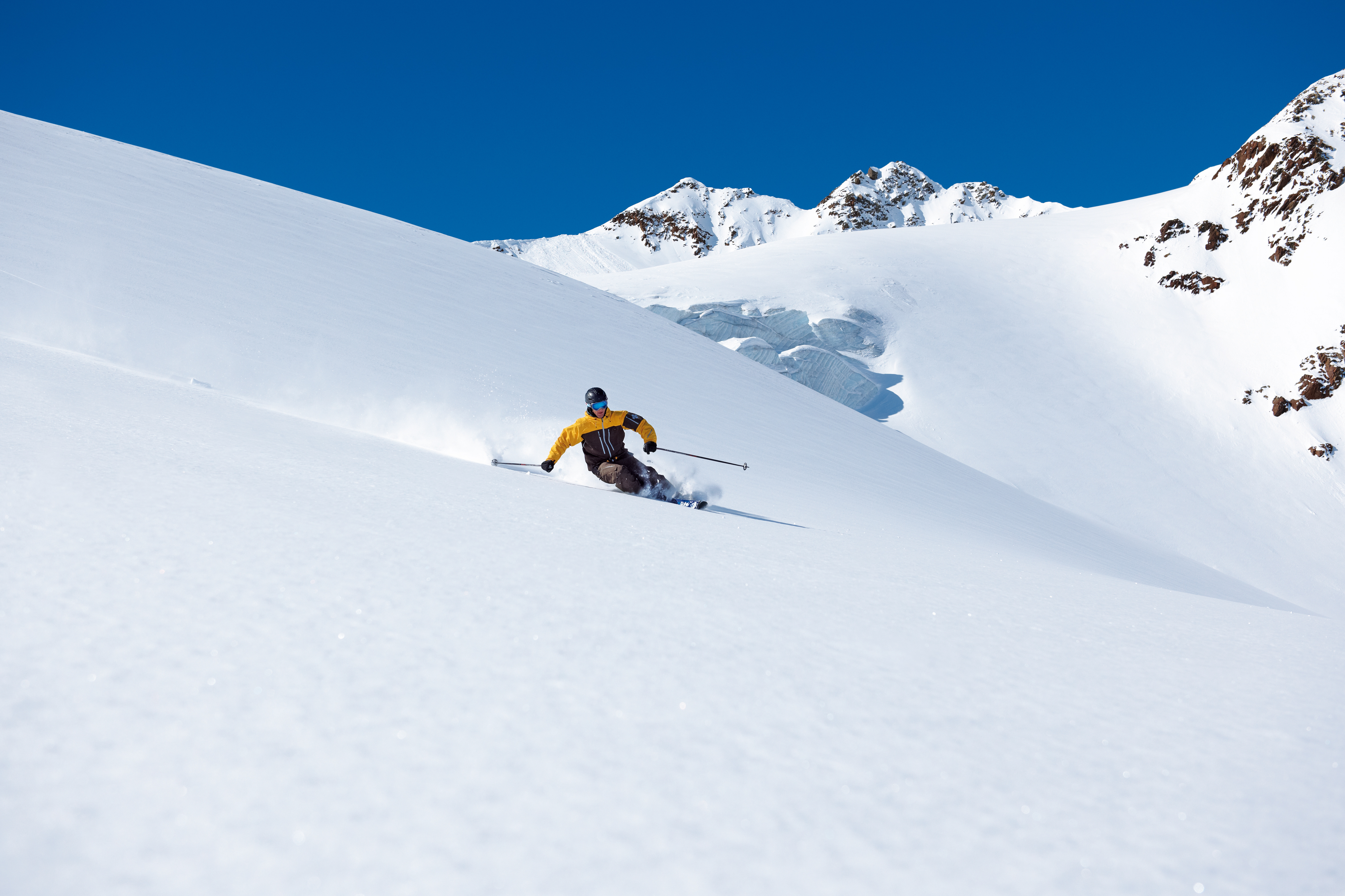 - Im professionell gesteckten Riesentorlauf können Racer das neueste Material der Skiindustrie von Blizzard, Kästle, Scott und Sochi Ski im Stangenwald auf Herz und Nieren testen. - Auch Freestyler kommen nicht zu kurz, denn die neuesten Snowboards der Firma Nitro warten darauf, im Snowpark getestet zu werden! - Für Abwechslung sorgt das Schnupper Eisklettern mit dem Bergführerbüro Pitztal. Wagemutige können diese fordernde Sportart und zugleich das neueste Material der Firma Petzl ausprobieren. - Sportlich geht es weiter zum Skitourentest der Firma Kästle. - Um sich in Sachen Sicherheit im freien Gelände auf den neuesten Stand zu bringen, oder seine Fähigkeiten mit dem LVS Gerät, Sonde und Schaufel testen möchte, der ist herzlich zum Pieps Suchfeld & zur Reichweitenmessung eingeladen. Geschulte Bergführer stehen Interessierten Rede & Antwort. - Einen kühlen Kopf bewahren Freerider mit den neuesten Protektoren und Helme der Firma Scott. - Die neuesten Freeride Ski von Scott, Blizzard, Kästle und Sochi Ski sind auch mit im Gepäck und stehen zum Test bereit. - Mit Spannung erwartet das Publikum zur Mittagszeit eine Vorführung der ganz besonderen Art. Zwischen Himmel und unberührten Gletscherhängen zeigen Luftakrobaten, was in ihnen und ihrem waghalsigen Sport steckt. - Umrahmt wird das Programm von DJ Beats auf der Sonnenterrasse. - Ein Erinnerungsfoto, zwei, drei.. 'Des geht si net aus' würde der Pitztaler sagen. Um das ganze Treiben am Pitztaler Gletscher einzufangen, können Helmkameras von GoBandit ausgeliehen werden. - Kreative Köpfe können ihren Film zum Facebook Gewinnspiel einreichen und damit an der Auslosung einer Saisonkarte für den Pitztaler Gletscher und einer Helmkamera teilnehmen.