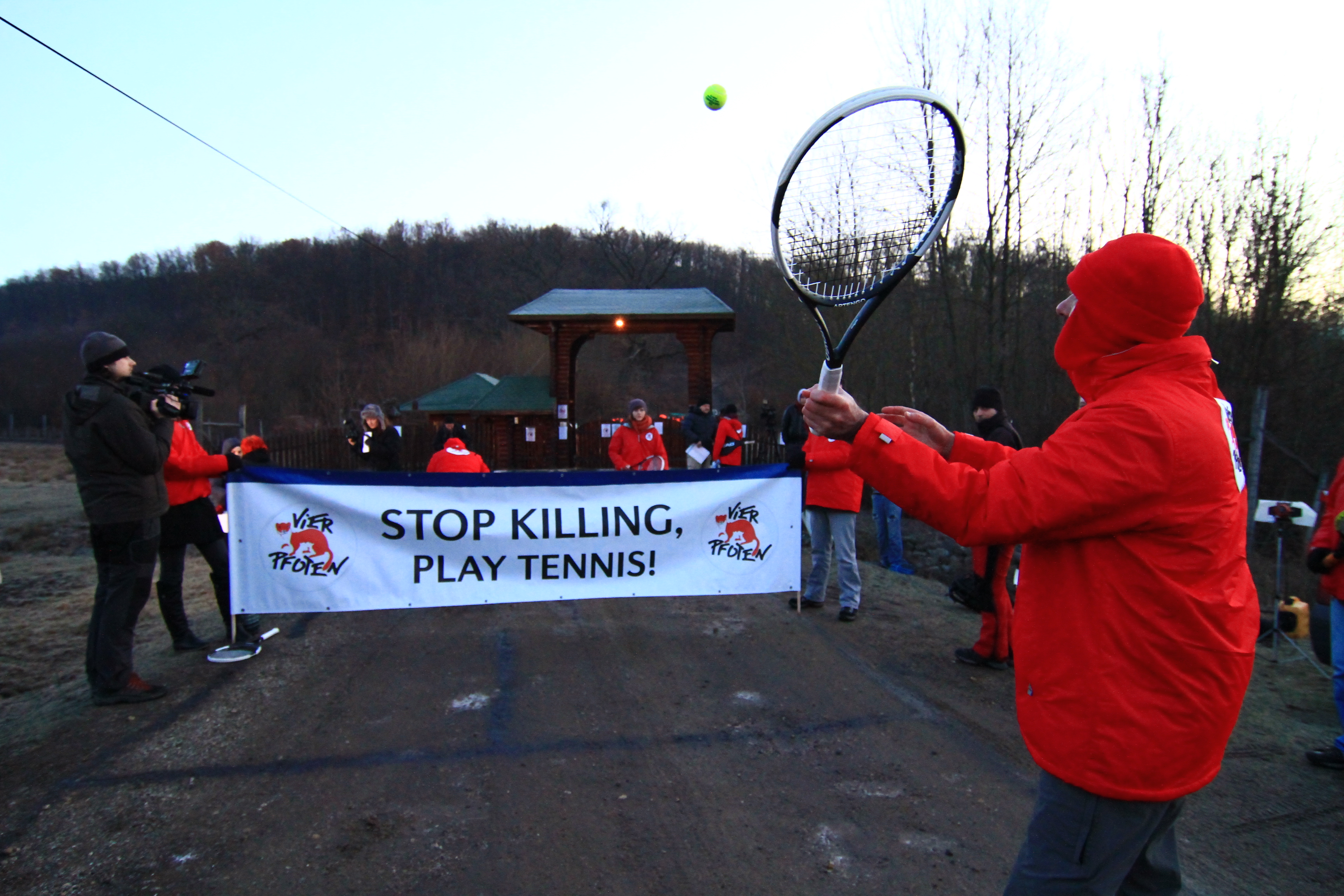 PFOTEN die Jagdgäste auf, mit den Aktivisten Tennis zu spielen