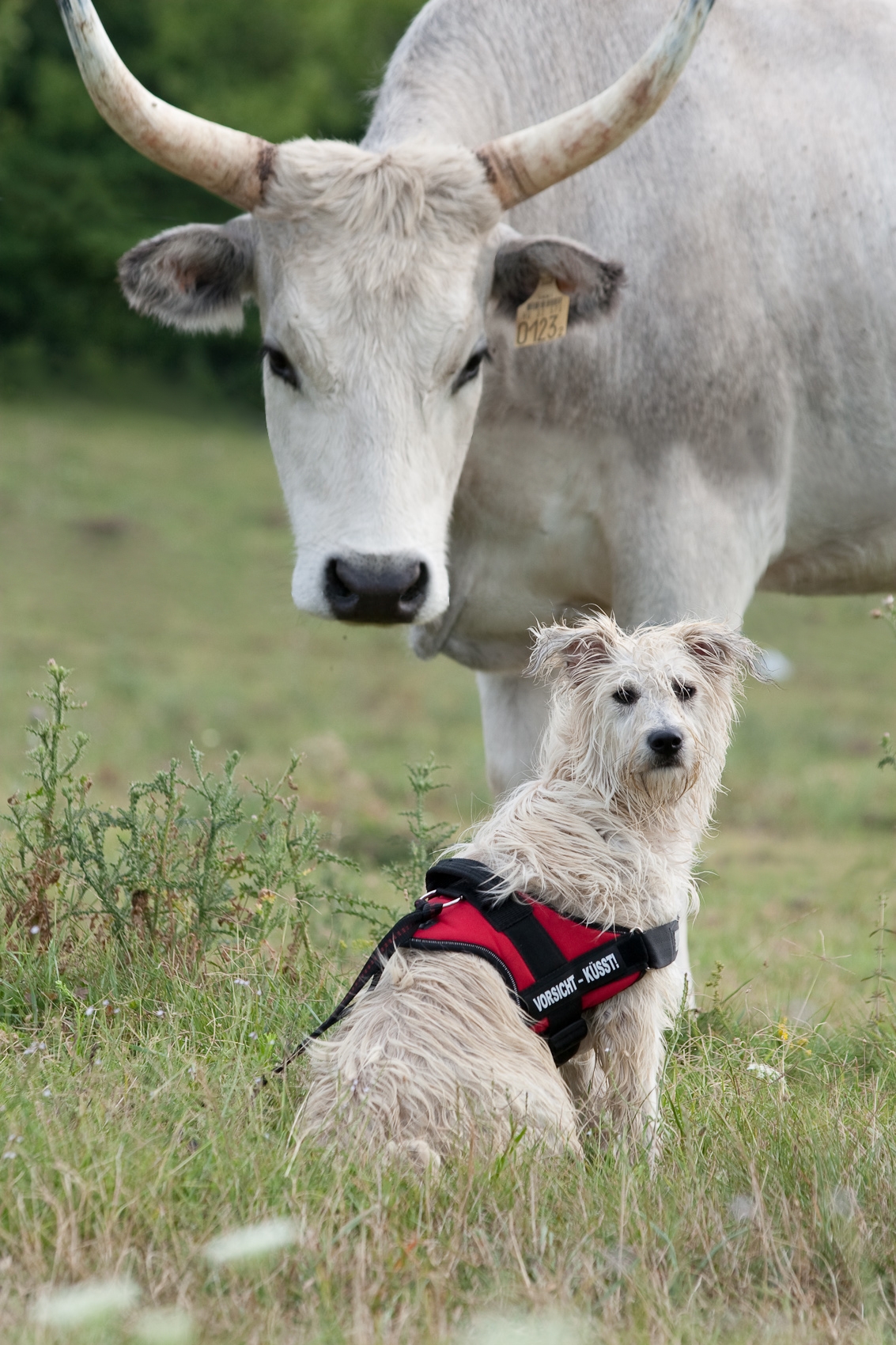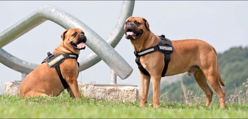 Aufschriften auf den Hundegeschirren wie "Kampfschmuser", "Ich war's