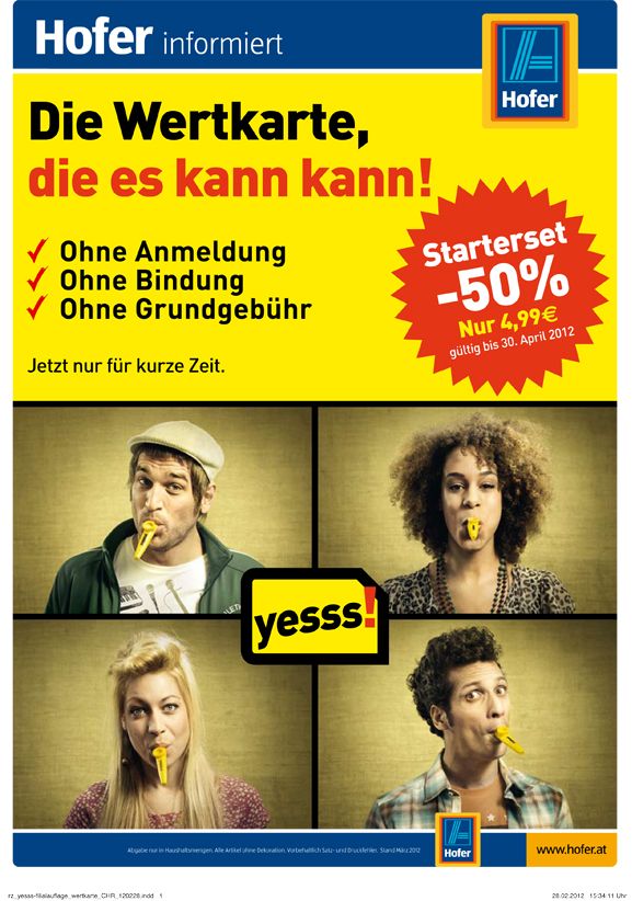Exklusiv bei Hofer und im Webshop: YESSS! Wertkarte inkl. 90 Min Guthaben - ohne Anmeldegebühr, Vertragsbindung oder Mindestumsatz - um nur 4,99 statt 9,99 Euro