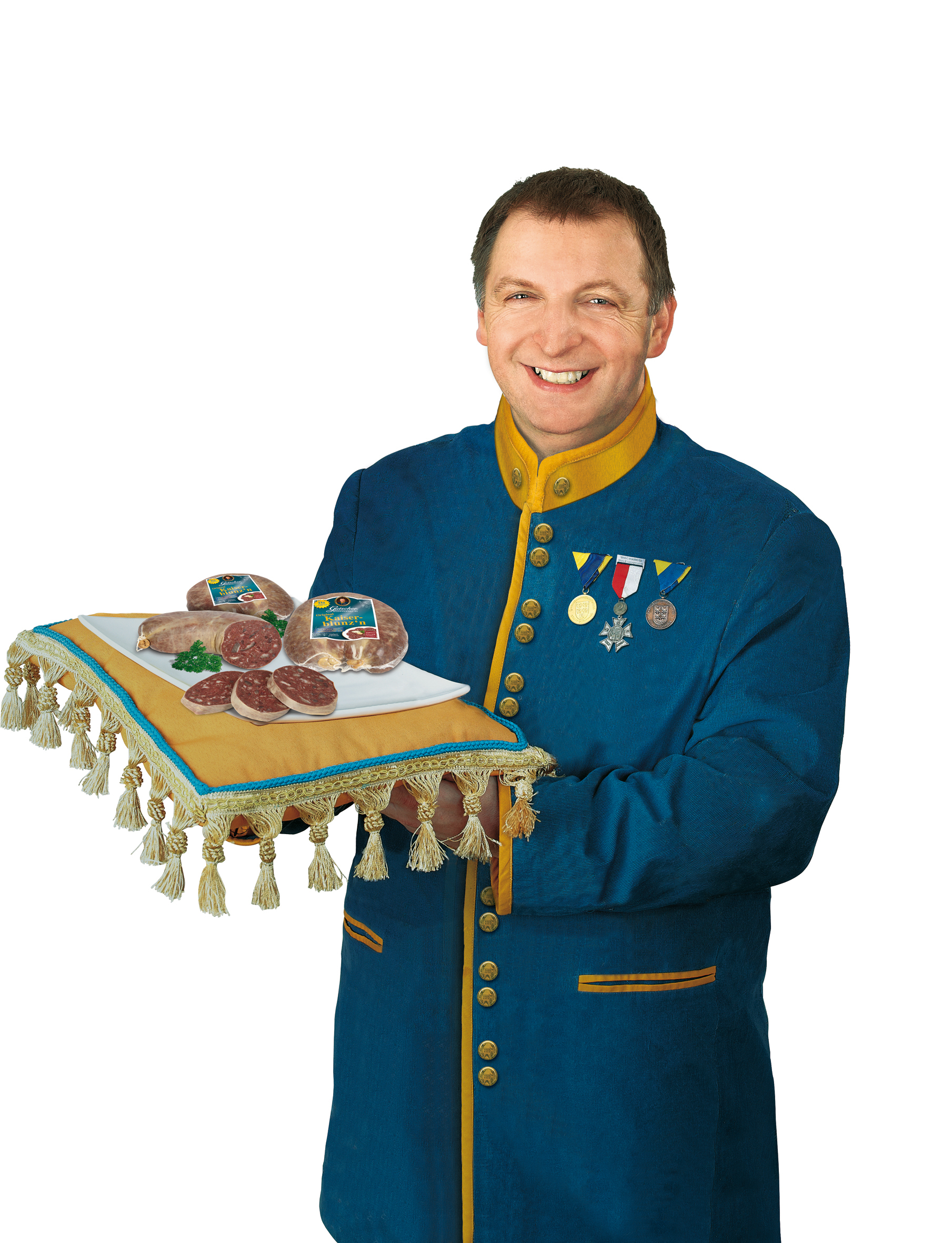 Blunznkaiser mit den Spezialitäten die er in seinem Betrieb herstellt