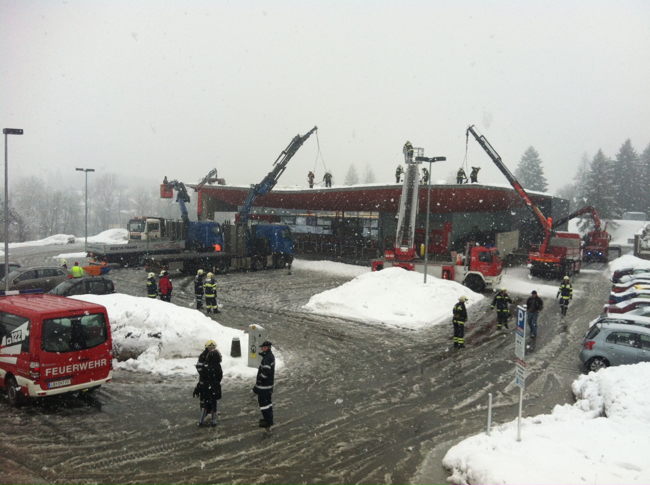Feuerwehrleuten vor Ort und haben das Dach von den Schneemassen