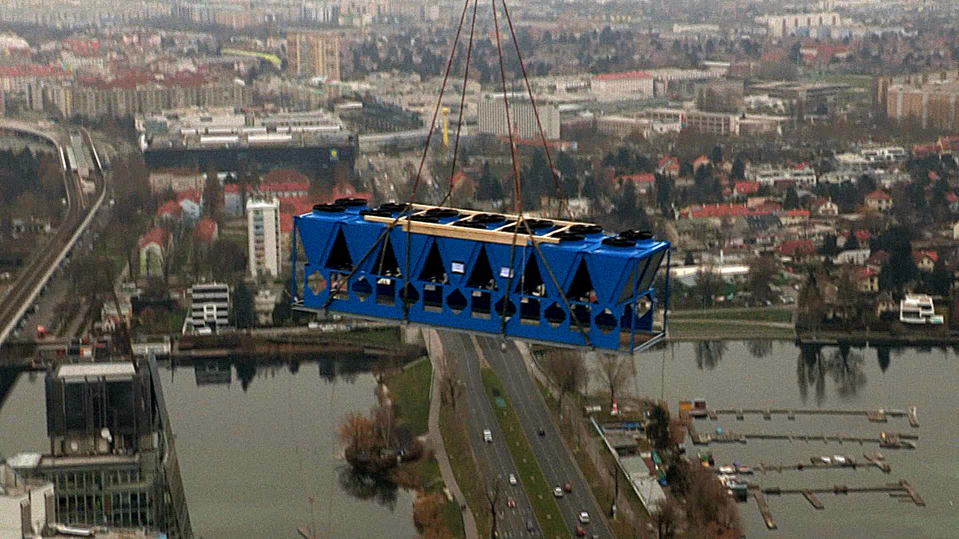 langen Seil transportierte ein Helikopter die neue Kälteanlage aufs