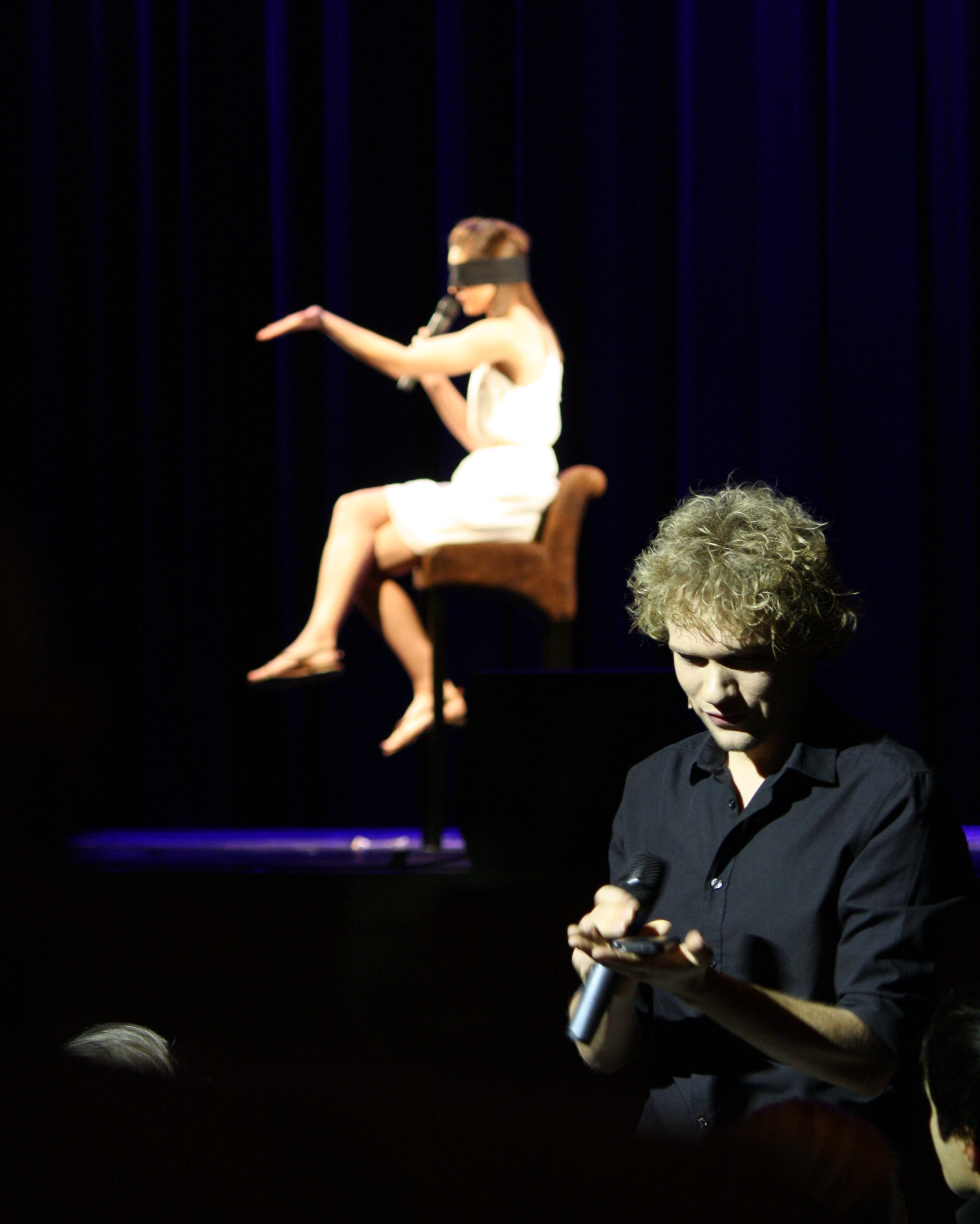 Sie sitzt mit verbundenen Augen auf der Bühne, Thommy Ten befindet
