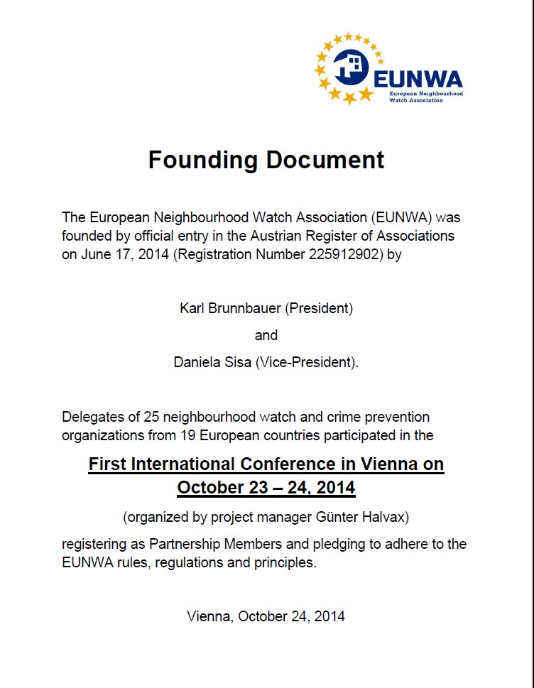 Karl L. Brunnbauer EUNWA – European Neighbourhood Watch Association (Vereinigung Europäischer und Außereuropäischer Nachbarschaftlicher Sicherheitsinitiativen) Tel.: 0681 10 40 14 12 [email protected] www.eunwa.org
