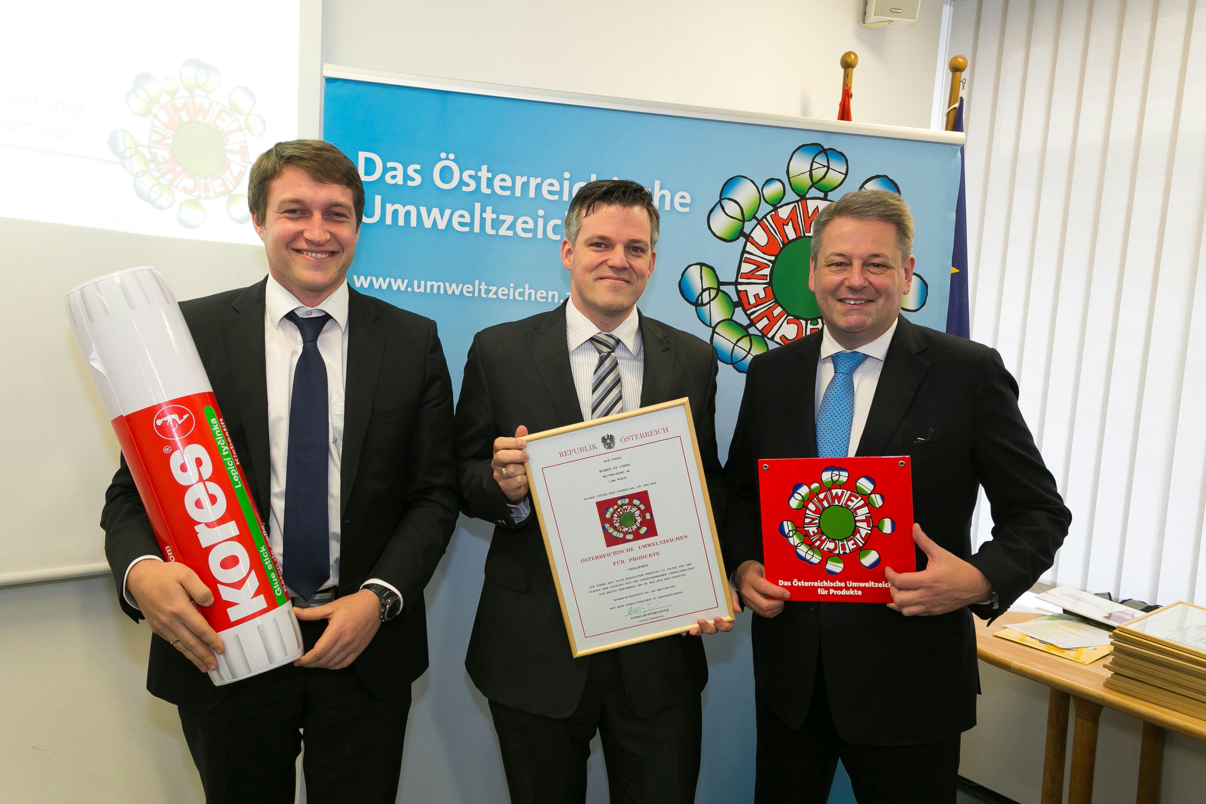 BM Andrä Rupprechter überreichte am 5. Dezember das österreichische Umweltzeichen an Kores Österreich für die Produktion der umweltfreundlichen Klebestifte