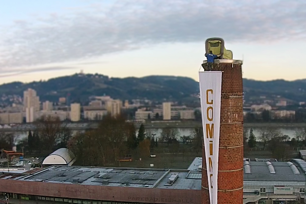 + Flug vom 40 Meter hohen Industrieschlot der Linzer Tabakfabrik
