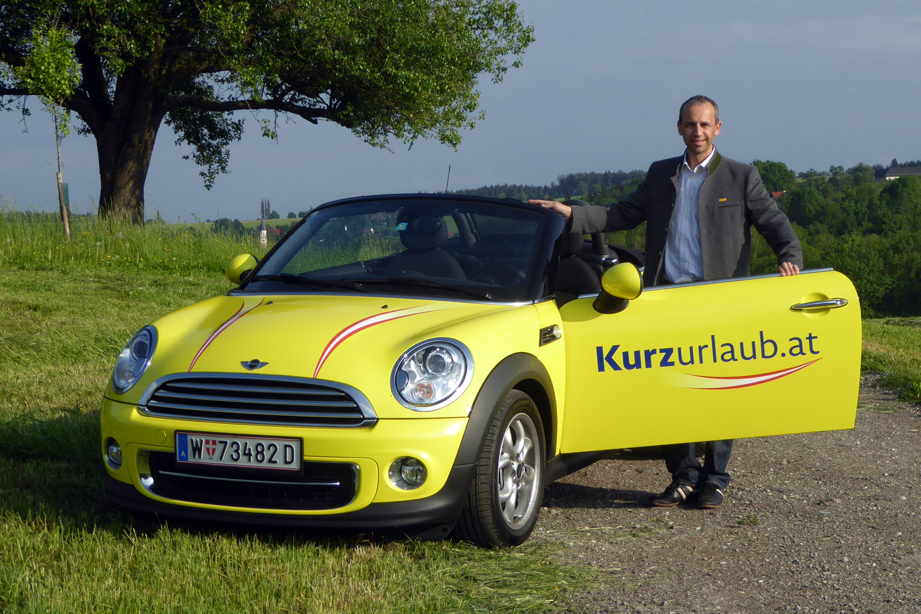 seinem auffälligen MINI Cabrio durch Österreich. Ziel seiner Reise