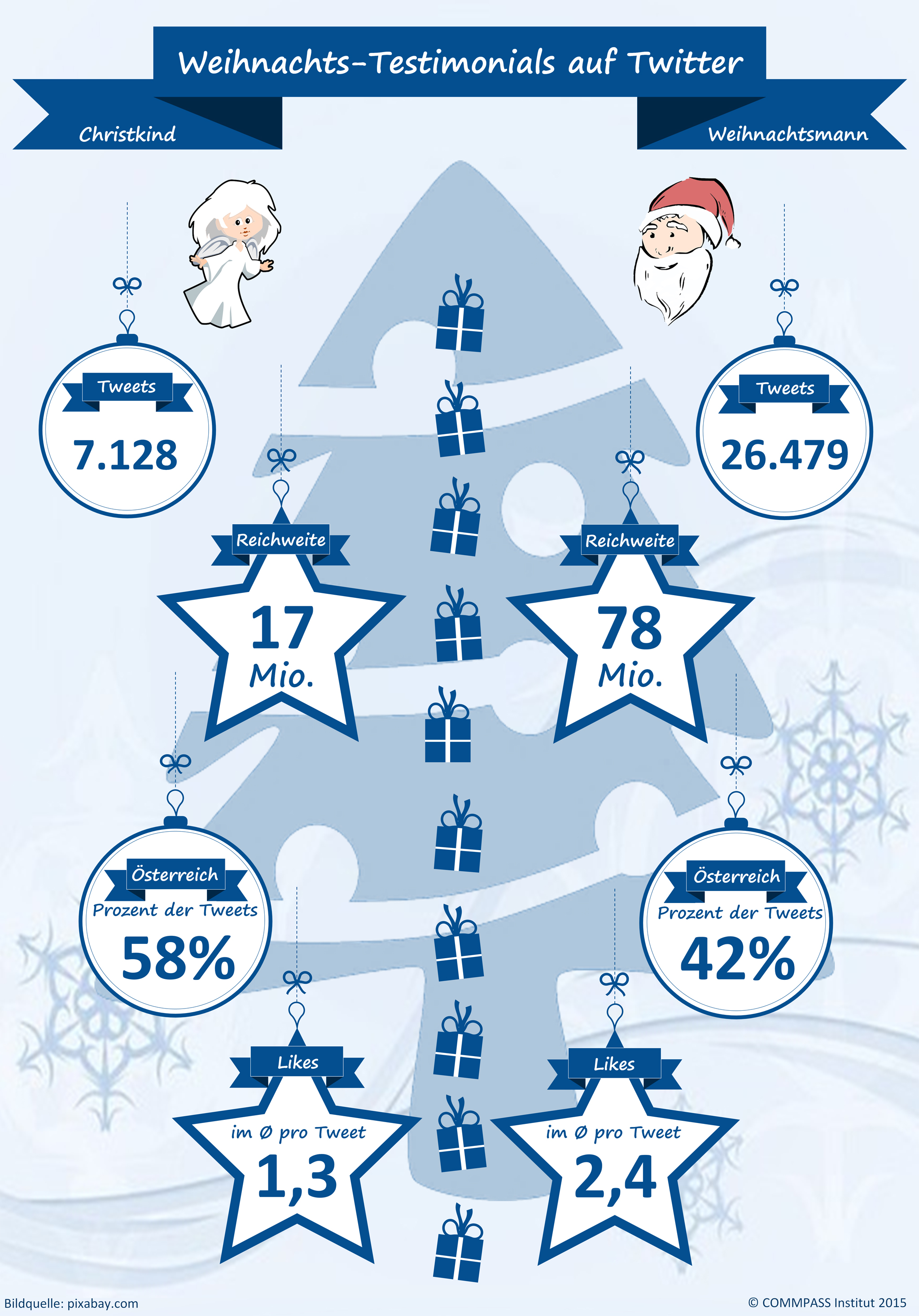 Der Weihnachtsmann hat eine größere und einflussreichere Fan-Gemeinde auf Twitter als das Christkind. Nur in Österreich sieht es anders aus, zeigt eine Analyse des COMMPASS Instituts.