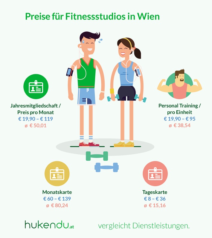 hukendu.at, Österreichs erste unabhängige Vergleichsplattform für Dienstleistungen, hat die Preise von Fitnessstudios in Wien verglichen. Die Unterschiede sind enorm. Jahresmitgliedschaften kosten zwischen 239 und 1428 Euro - angesichts der Preisgestaltung mancher Studios wird sogar die Geldbörse schlank.