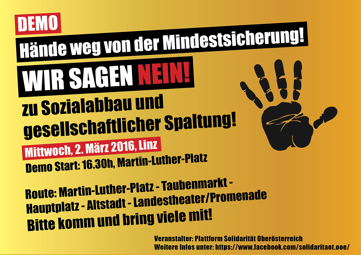 Plattform Solidarität OÖ ruft für Mittwoch, 2. März 2016 zu einer Demonstration in Linz gegen die geplanten Kürzungen bei der Mindestsicherung auf.