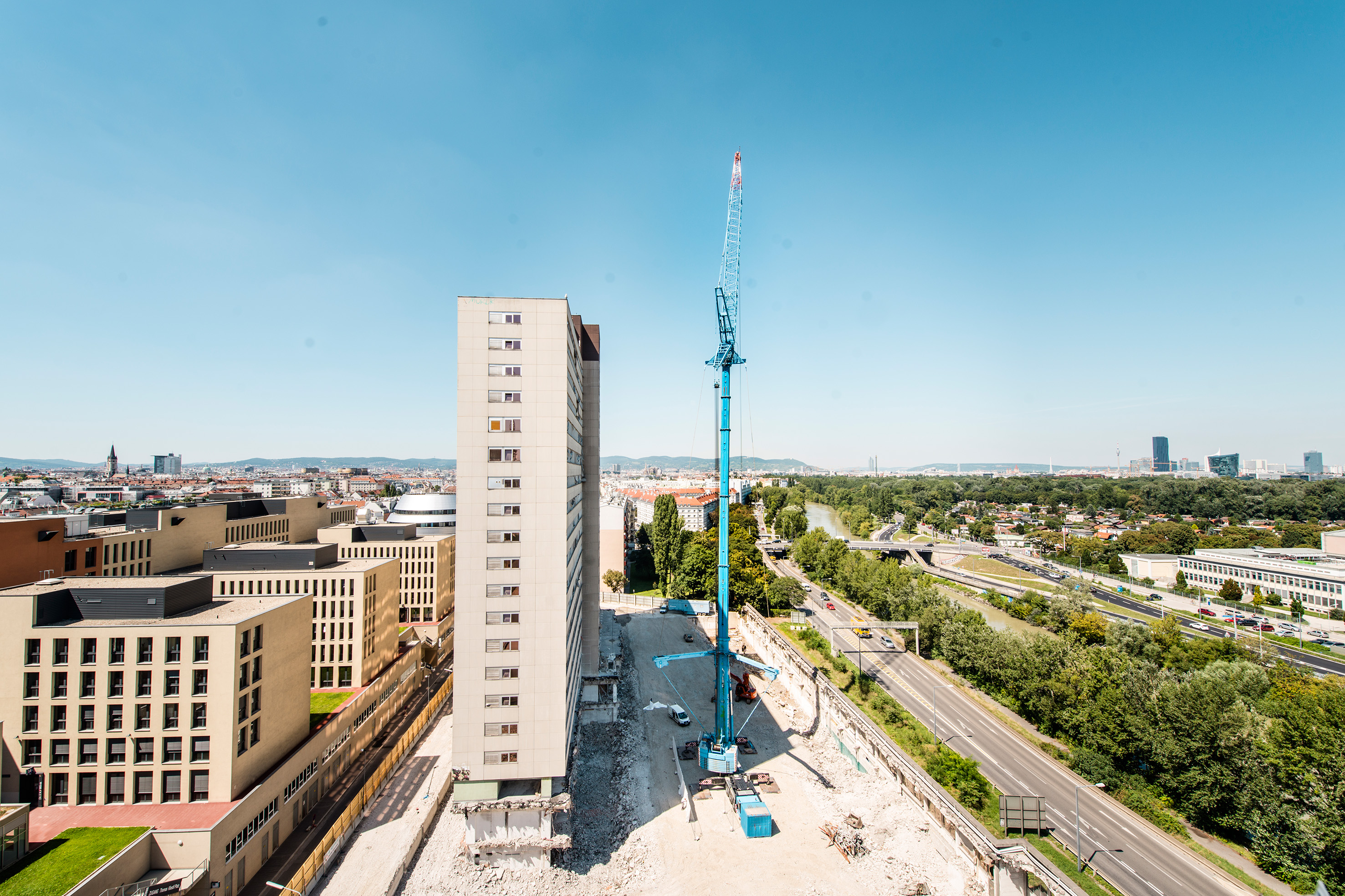 Nach der Entkernung startet nun der Abriss des 17-stöckigen Gebäudes