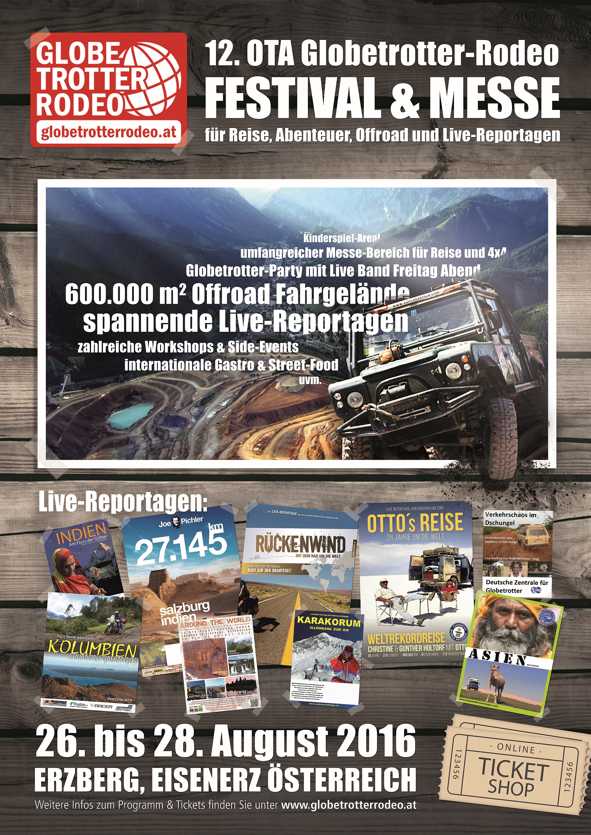 Pressekonferenz: Offroad - Abenteuer - Reisen Als Auftakt der 12. Ausgabe des OTA Globetrotter-Rodeos informieren wir eine Woche vor der Veranstaltung über einige Highlights des diesjährigen Reise- und Offroad-Festivals. Im Pressegespräch: Gunter Holtorf: „Ottos Reise“ 215 Länder, 900.000 Kilometer, 26 Jahre lang unterwegs -Weltrekordreise mit dem Mercedes 300 GD. Dipl. Ing. Christof Danner, Danner Racing Team: einziges österreichisches Team in der Cross Country Weltmeisterschaft mit einzigem in Österreich homologierten FIA T1 Rallye-Fahrzeug, 7-facher Touareg-Rally-Gesamtsieger mit dem Grazer Fahrzeug: Puch G 320 5,5 AMG Matthias Hurmer Style-X Vertriebs GmbH: erstmalige Präsentation des Allrad-Ford-Transit in Österreich Dipl.-Ing. (FH) Stefan Maier, Veranstalter des OTA Globetrotter- Rodeos informiert über die Veranstaltung. Anmeldung bitte bis 16.08.2016 unter: [email protected] Tel.: +43 (0) 664 203 90 14 Datum: 18.8.2016, 13:00 - 14:00 Uhr Ort: Hotel Novapark Fischauerstraße 22, 8051 Graz Url: http://globetrotterrodeo.at/pressebereich/