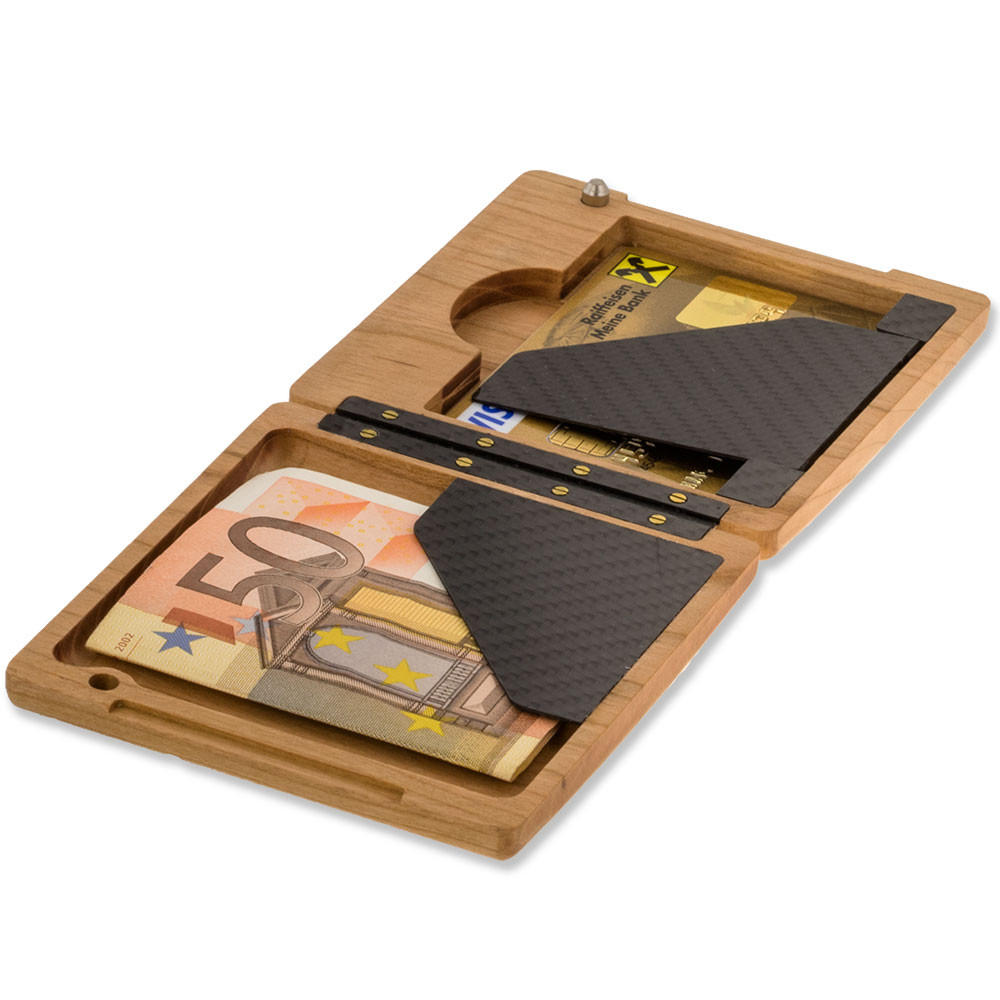 Holz-Carbon-Brieftaschen, die es in Nuss- und Eichenholz gibt, um 99