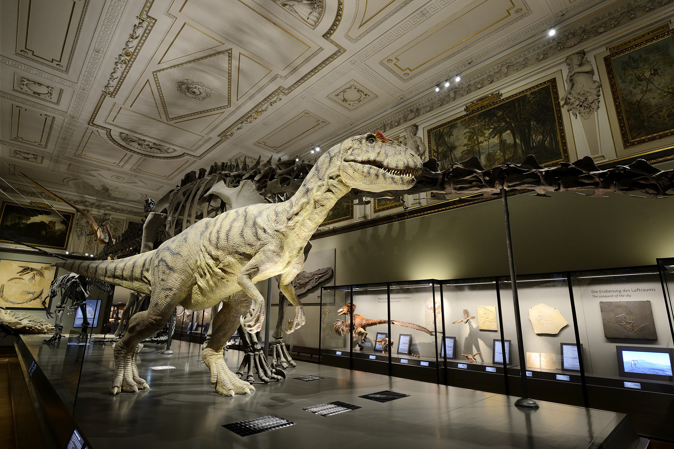 Im Sauriersaal triffst du um 12:15 und 12:45 Uhr auf einen frei laufenden Allosaurus.