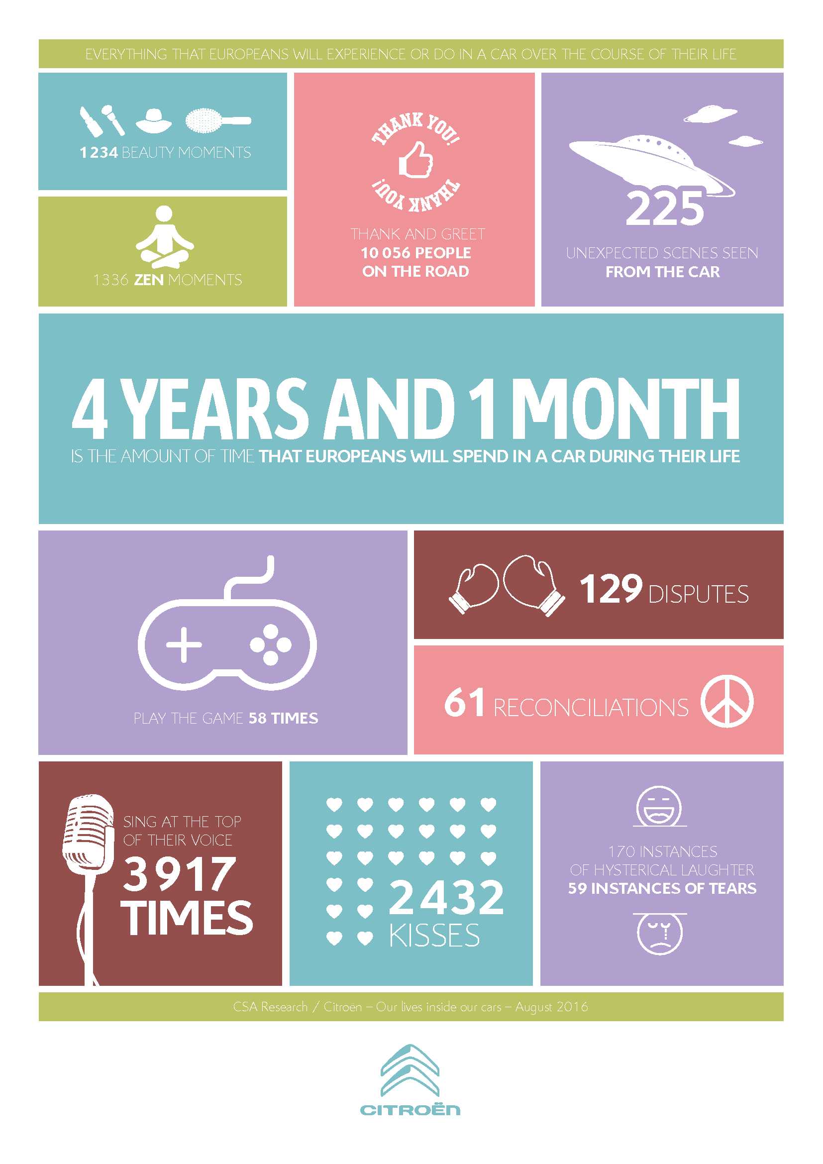Die Ergebnisse dieser Studie des Marktforschungsinstituts CSA spielen eine tragende Rolle in der neuen Kampagne von Citroën: „CITROËN INSPIRED BY YOU”. Ein TV-Spot und verschiedene Kurzfilme sind geprägt von Bildern und Situationen, die die Autobenützer während ihrer Autofahrten im realen Leben erleben. Im Hauptteil des Werbespots wird verdeutlicht, wie viel Zeit wir in Europa im Auto verbringen, und wie wichtig das persönliche Wohlbefinden dabei ist. Zudem werden Situationen aus 4 Jahren und 1 Monat im Auto zu einem amüsanten Film zusammengefasst.