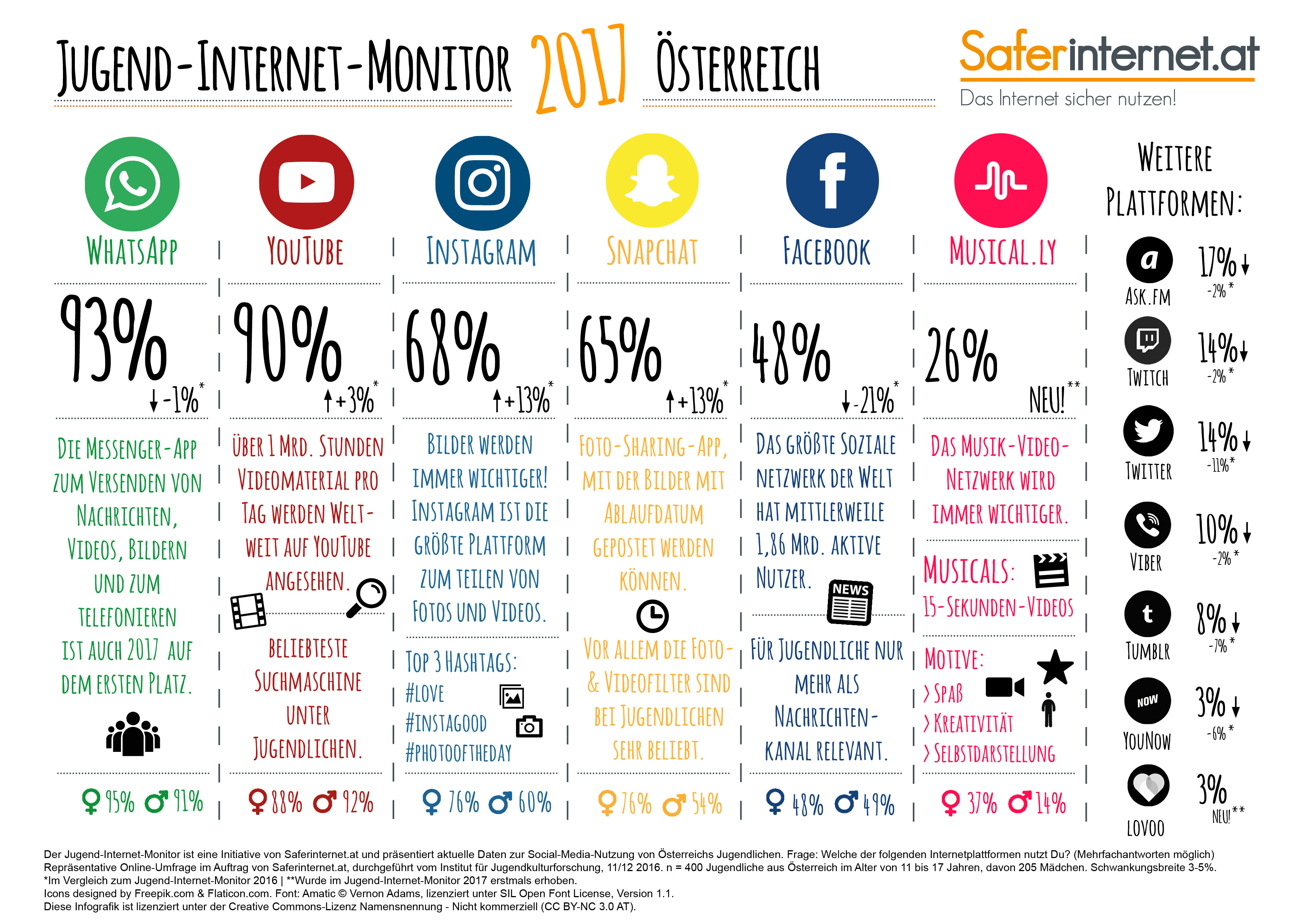 Bereits zum zweiten Mal präsentiert Saferinternet.at den Jugend-Internet-Monitor. In einer repräsentativen Umfrage wurden die beliebtesten Sozialen Netzwerke von Jugendlichen in Österreich ermittelt. WhatsApp und YouTube sind weiterhin die beliebtesten Netzwerke, im Vergleich zum Vorjahr verliert vor allem Facebook an Relevanz. Als Neueinsteiger dazu gekommen ist das Musik-Video Netzwerk musical.ly.