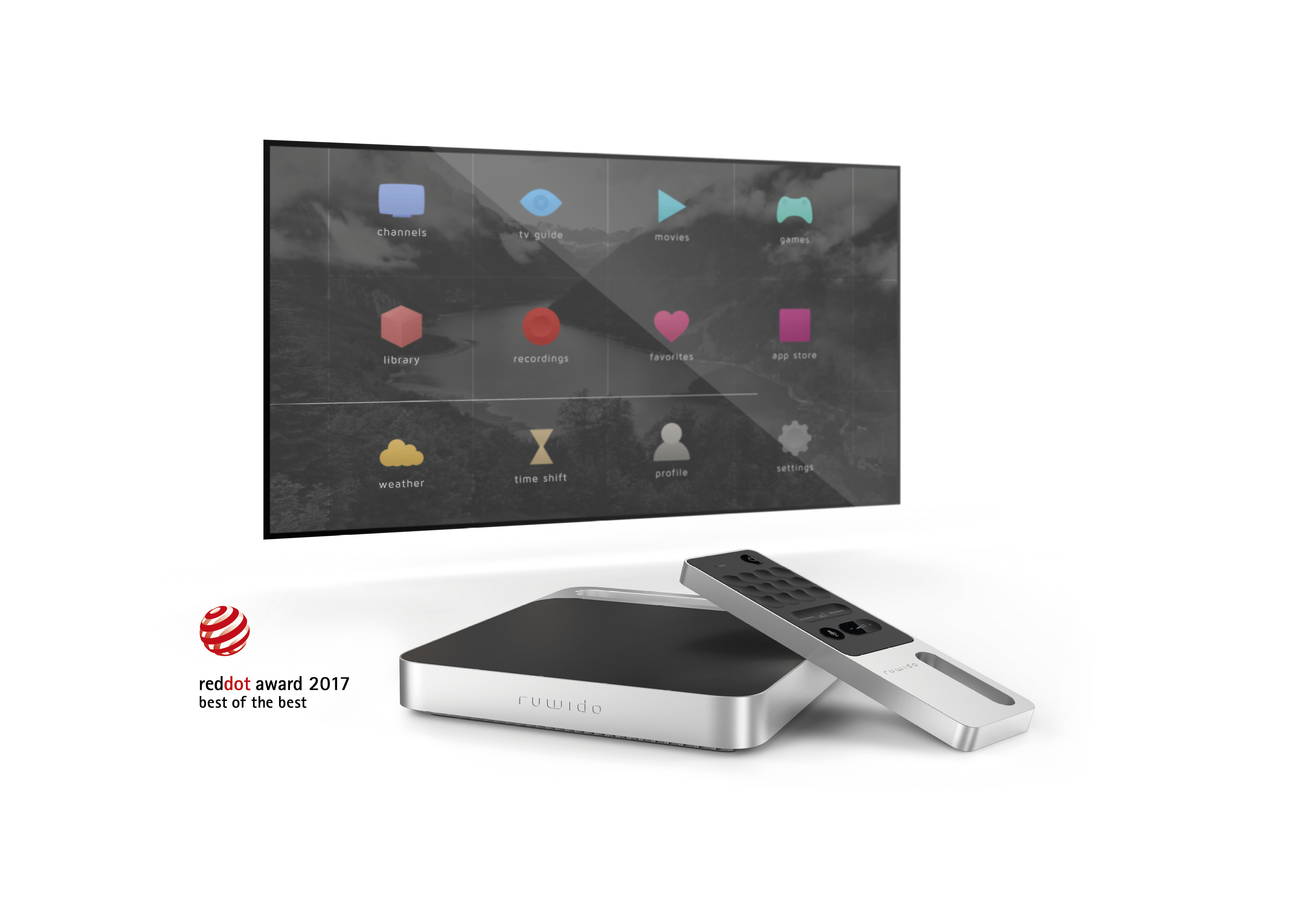ruwido wurde in Zusammenarbeit mit der Designschmiede Zeug mit der höchsten Auszeichnung der red dot product design awards 2017 in der Kategorie: TV und Home Entertainment geehrt.