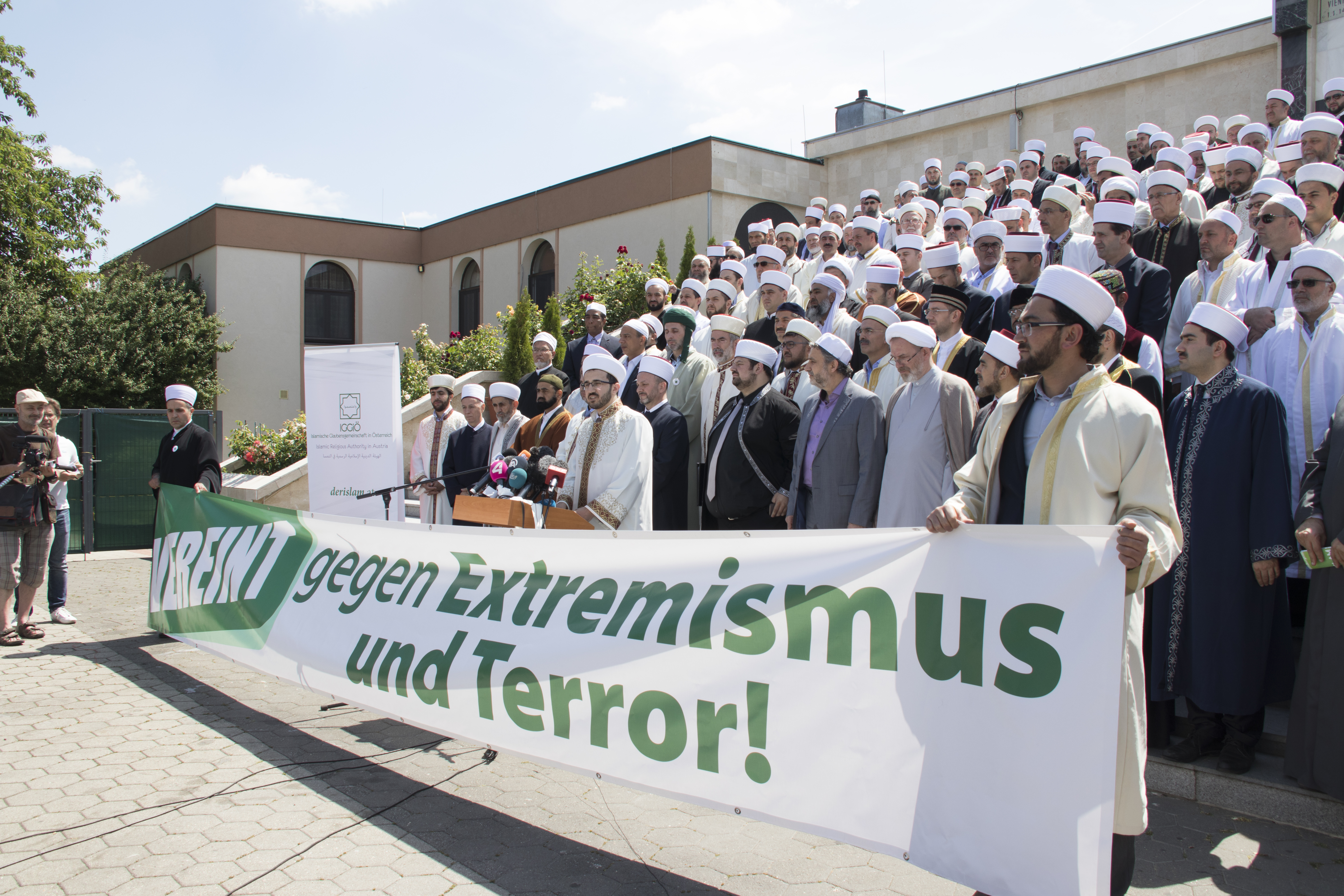 Heute, am Mittwoch den 14. Juni 2017 setzten die Imame der Islamischen Glaubensgemeinschaft (IGGÖ) ein kollektives Zeichen gegen Terror und Extremismus. Zahlreiche Imame versammelten sich vor dem Islamischen Zentrum in Floridsdorf und unterzeichneten eine gemeinsame Deklaration und verurteilten die terroristischen und extremistischen Gewaltakte auf der ganzen Welt, die im Namen des Islam ausgeübt werden.
