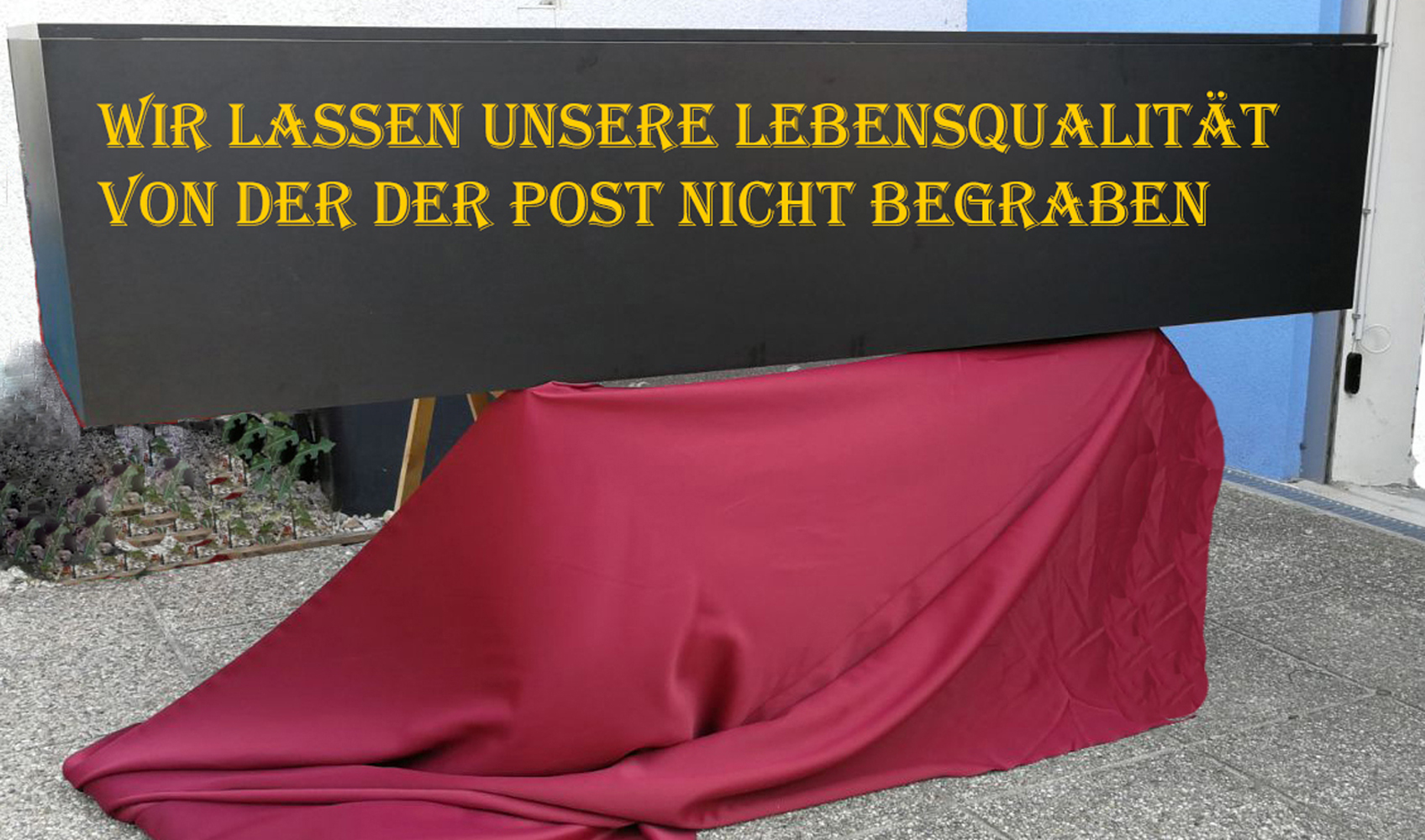 Der im Trauermarsch mitgeführte Sarg enthält die von der Post totgeschwiegenen negativen Auswirkungen des geplanten Postverteilerzentrums. Angeführt wird der Zug von Brigtte Etzelsdorfer, der trauernden Gründerin der Bürgerinitiative. Das Kondolenzbuch der Trauergemeinde wird im Anschluss der Post übergeben.